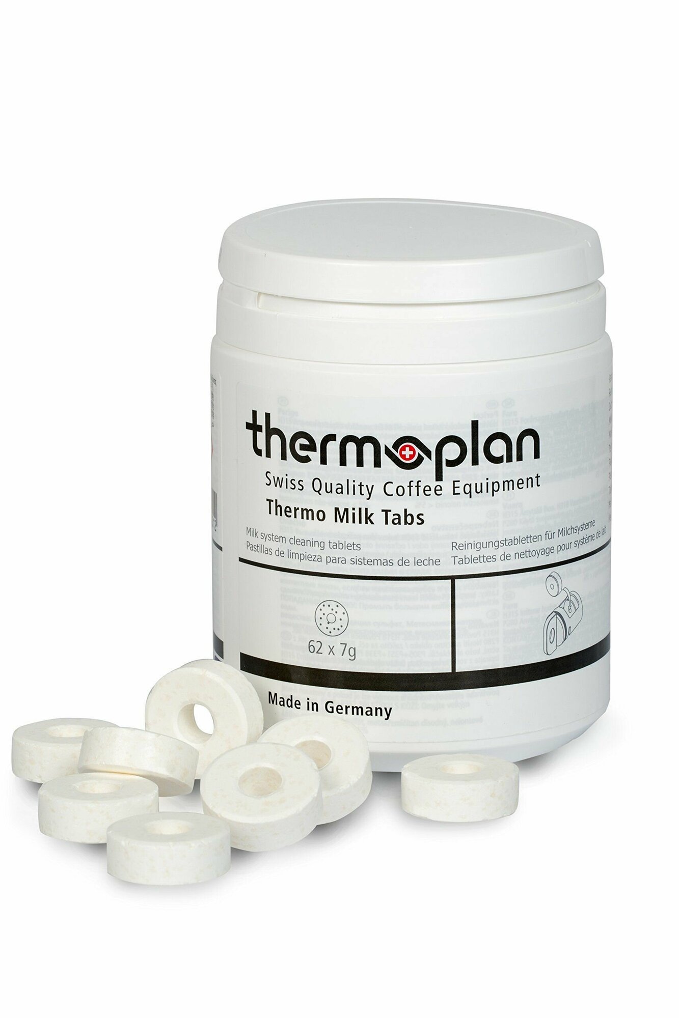 Чистящее средство в таблетках для очистки молочной системы белого цвета суперавтоматических кофемашин Thermoplan. Круглая форма в таблетках с отверстием обеспечивает идеальную дозировку чистящего средства.