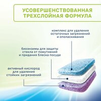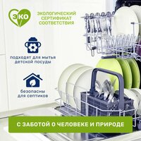 Одна таблетка полностью обеспечивает весь цикл мытья и ополаскивания посуды и гарантирует ее кристальную чистоту.