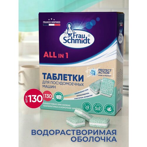 Frau Schmidt Таблетки для мытья посуды в посудомоечной машине "Все в 1" 130 таб. - Инновационное средство для мытья посуды, экологичные и высокотехнологичные таблетки для посудомоечной машины. Благодаря своей уникальной формуле, отличительная особенность этих инновационных таблеток - они оптимально подходят для короткого (низкотемпературного) цикла, обеспечивая при этом высочайшее качество мойки. В составе высокое содержание перкарбоната натрия (он же отбеливатель на основе кислорода) - эффективное чистящее средство, удаляет органические загрязнения, следы от кофе, чая и т. д, является дезинфицирующим агентом (уничтожает бактерии, которые остаются при мойке до 70 гр. цельсия). При этом отсутствуют вредные испарения, щадящее воздействие на материалы и красители, безвреден для окружающей среды. Таблетки Frau Schmidt абсолютно безопасны для человека, в том числе и для детей, так что теперь вы можете смело мыть детскую посуду в посудомоечной машине! Таблетки Frau Schmidt не содержат агрессивных ПАВ и полностью смываются с посуды, не оставляя разводов и известкового налета, нейтрализуют запахи. При этом благодаря уникальной биоформуле таблетки суперэффективно удаляют жир и стойкие загрязнения даже при низких температурах. Ваша посуда из стекла и нержавеющей стали станет безупречно чистой и сияющей. В составе таблеток - специальная соль, очиститель и ополаскиватель. Соль и очиститель способствуют правильной работе машины, смягчая жесткую воду и защищая посудомоечную машину от образования известкового налета и накипи, а ополаскиватель бережно очищает вашу машину от остатков загрязнений. Теперь все функции для мытья посуды и эффективной защиты вашей машины – в одной таблетке! Таблетки Frau Schmidt полностью биоразлагаемы и безопасны для септиков. Примечание: таблетки для посудомоечных машин Frau Schmidt All in 1 (Форма выпуска 130 шт), которые ранее изготавливались во Франции, теперь производятся в России. Пожалуйста, обратите внимание, что это изменение места производства не отразилось на качестве нашего товара. Продукция Фрау Шмидт соответствует высоким стандартам, обеспечивая отличные результаты при каждом использовании.