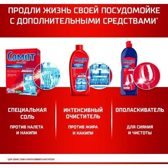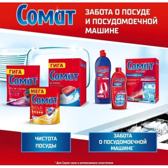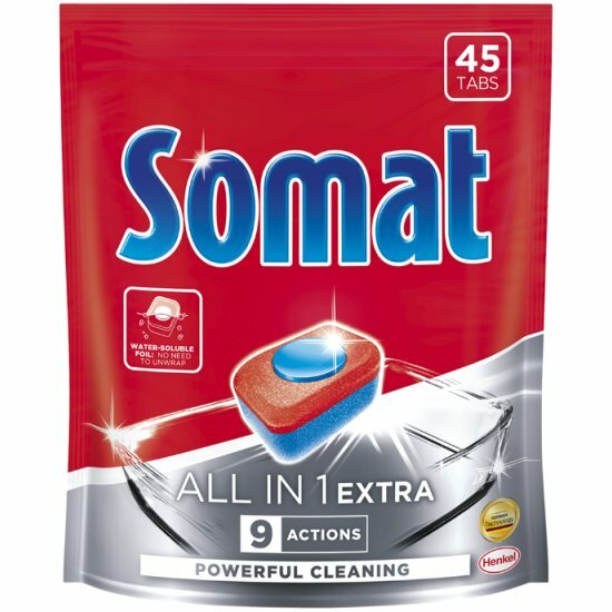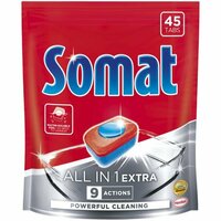 Таблетки для посудомоечной машины Somat All in 1 Extra - это мультифункциональное моющее средство. Таблетки действуют в 9 активных направлениях для чистоты посуды и самой техники. - Средство обеспечивает полное очищение посуды даже от присохшей еды. - Таблетки Сомат избавят вас от лишних усилий и трудозатрат без потери результата. - Средство Somat All in 1 эффективны против любых загрязнений, включая налет от чая и кофе. - Таблетка быстро и без остатка растворяется. - Использование средства не требует использования отдельного ополаскивателя. - Средство Сомат обладает функцией соли, поэтому дополнительное применение этого ингредиента не требуется. - Таблетки эффективны даже от пригоревшего жира. - Средство позаботится о посудомоечной машине, чтоб она прослужила долго и имела аккуратный ухоженный вид. - Таблетка Сомат обеспечивает безупречный результат при температуре 40 С. - Для мытья посуды на коротких циклах (30 минут) поместите таблетку на дно машины.