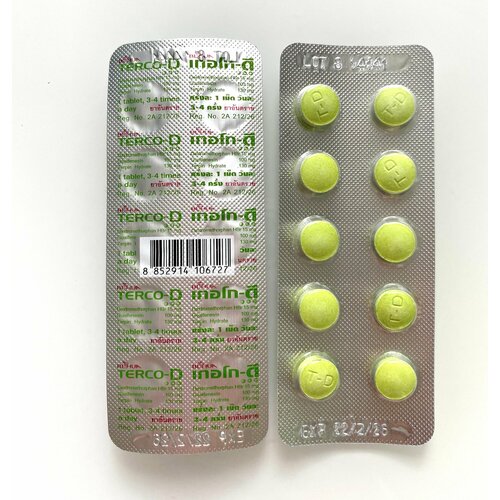 Таблетки от кашля "TERCO-D" от известного тайского производителя Thanyaporn Herbs представляют собой эффективное отхаркивающее средство, которое помогает справиться с сухим кашлем, трахеитом, бронхитом и бронхиальной астмой.