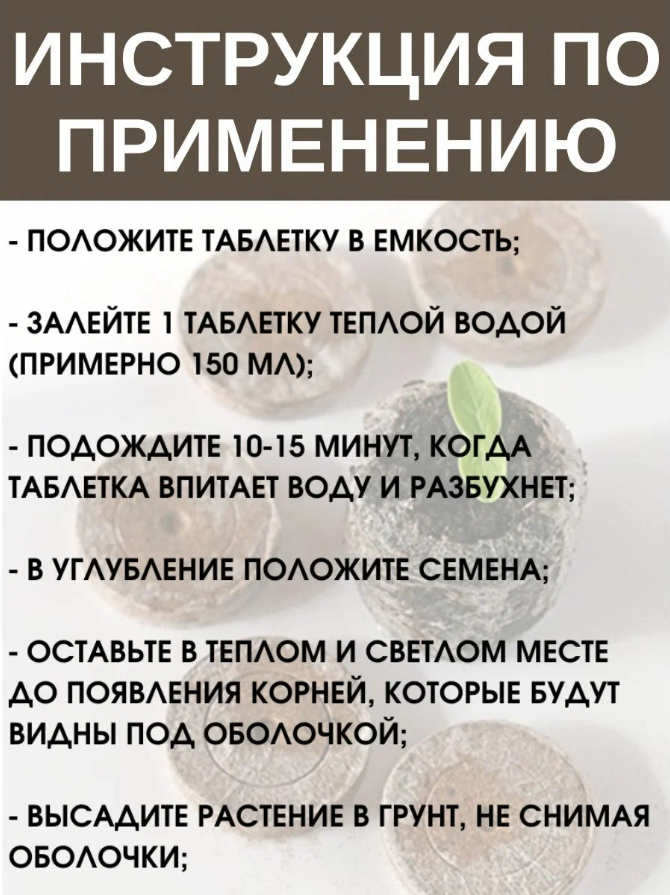 30мм 100 штук кокосовые таблетки Джиффи Jiffy / кокосовый субстрат таблетка / кокосового субстрата / кокосовые таблетки для рассады / кокосовые таблетки jiffy / Кокосовыми таблетками называют небольшие бруски прессованного субстрата цилиндрической формы, помещенные в мелкоячеистую сетку. Состоят из кокосового перегноя, волокон и стружки. Для лучшего эффекта в таблетки добавлены питательные вещества и микроэлементы. Кокосовый перегной готовят из измельченной скорлупы, которая ферментировалась в течение года. Из-за особенности произрастания, кокосы не подвержены заболеваниям, свойственным растениям, плоды которых растут ближе к земле. Поэтому субстрат свободен от многих бактерий и грибков, представляющих опасность для рассады. Кокосовые волокна имеют небольшую питательную ценность. Главная польза их применения – существенное улучшение структуры почвы. Волокна делают почву более легкой, это облегчает поступление кислорода к корням, и улучшает питание растений. Кокосовая стружка содержит магний, железо, калий, фосфор, кальций и другие микроэлементы, которые находятся в легкой для усвоения растениями форме. Основное применение таблеток из кокоса – использование для выращивания рассады. Также свойства этого субстрата позволяют применять его для укоренения черенков. По сравнению с другими субстратами кокос имеет несколько важных преимуществ: Таблетки хорошо проводят воздух и тепло; Способны удерживать влагу, постепенно отдавая ее растениям; Имеют оптимальный уровень кислотности; Не содержат семян сорняков; Таблетки не теряют форму после замачивания; В сухом виде занимают немного места; После высыхания не образуют корку. Способность грунта хорошо проводить кислород очень важна для растений. В слишком плотной почве или при избыточном поливе корни растений испытывают кислорода, это вызывает нарушение обмена веществ, соответственно снижается способность усваивать питательные вещества. Рост растения замедляется, если ситуацию не исправить, возможна его гибель. Также поступлению кислорода может помешать корка, появляющаяся на поверхности грунта при высыхании. Кокосовый субстрат лишен этого недостатка. Кокосовые таблетки способны хорошо удерживать влагу, жизненно важную для рассады. При этом переувлажнить их невозможно, кокос впитает только определенное количество воды, которую будет постепенно отдавать корням всходов. Кислотность кокосового грунта находится на уровне, оптимальном для прорастания семян большинства культурных растений. Субстрат дополнительно обогащен комплексом полезных для роста растения микроэлементов. Количества питательных веществ достаточно для роста растения в течение 4 – 6 недель. Перед тем, как использовать кокосовые таблетки для выращивания рассады, необходимо промыть их от морской соли, которую применяют в процессе производства таблеток. Для этого таблетки ненадолго помещают под струю проточной теплой воды. Для очистки достаточно 1 – 2 минут. Таблетки помещают в кассеты или другие емкости для выращивания рассады. Необходимо иметь в виду, что емкость должна быть гораздо больше таблетки, потому что после увлажнения она значительно увеличивается в размерах. Брикеты заливают водой комнатной температуры на несколько минут, до полного впитывания. После этого оставшуюся воду сливают. В н