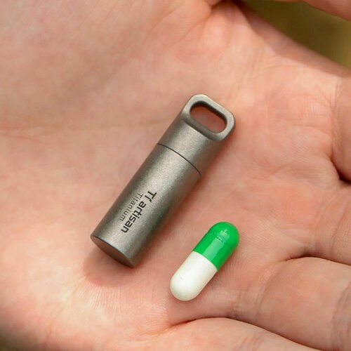 - Титановая таблетница выполнена в форме цилиндра. Имеет мини ручку дрежатель для пристегивания к карабину, ключам или для подвеса (например, на шею или любимому аксессуару).