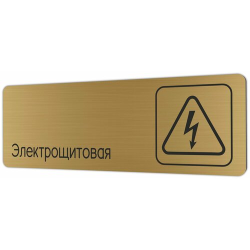 Табличка Электрощитовая из золотистого пластика с царапанной текстурой размером 30х10 см. На обратной стороне таблички - двусторонняя клейкая лента для монтажа таблички без сверления. Текст и пиктограмма на табличку наносятся методом гравировки, такм образом изображение на табличке не будет сдираться, а также устойчиво к выгоранию и механическим повреждениям. При необходимости табличку можно протирать влажной тряпкой или салфетками. Табличка с гравировкой с надписью Электрощитовая имеет сертификат ГОСТ и изготовлена из материалов не поддерживающих горение