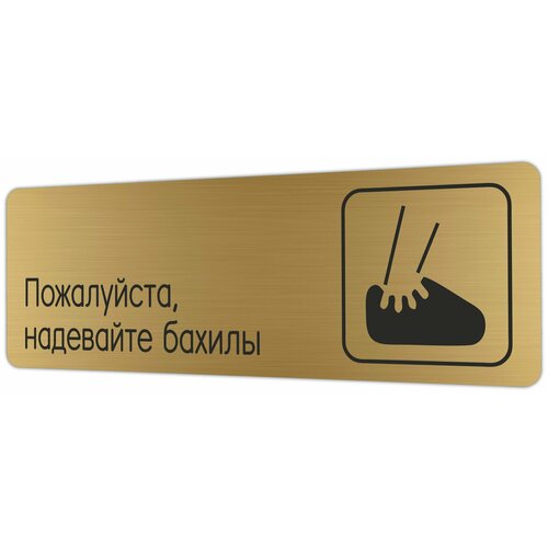 Табличка Надевайте бахилы из золотистого пластика с царапанной текстурой размером 30х10 см. На обратной стороне таблички - двусторонняя клейкая лента для монтажа таблички без сверления. Текст и пиктограмма на табличку наносятся методом гравировки, такм образом изображение на табличке не будет сдираться, а также устойчиво к выгоранию и механическим повреждениям. При необходимости табличку можно протирать влажной тряпкой или салфетками. Табличка с гравировкой с надписью пожалуйста, надевайте бахилы имеет сертификат ГОСТ и изготовлена из материалов не поддерживающих горение
