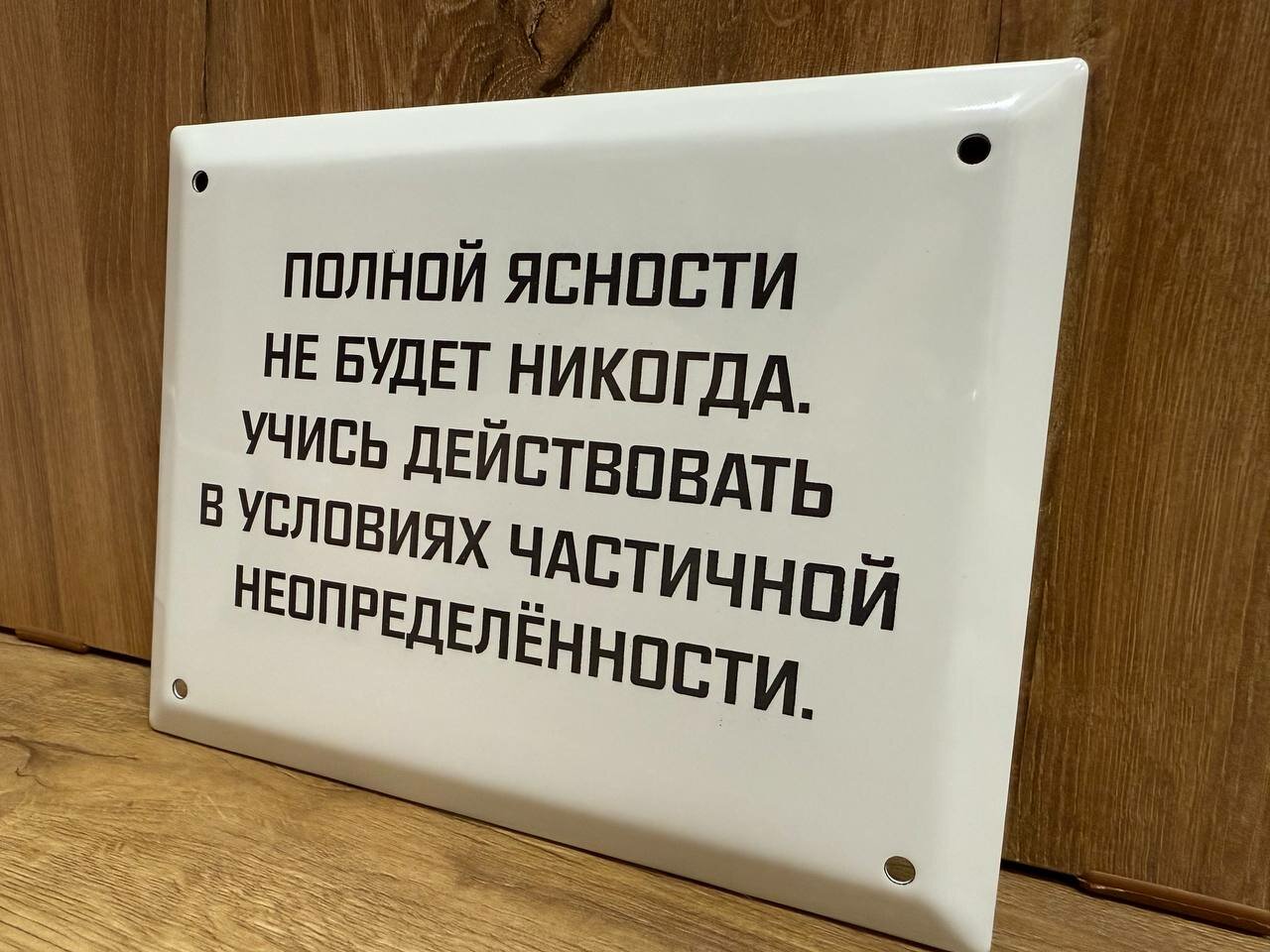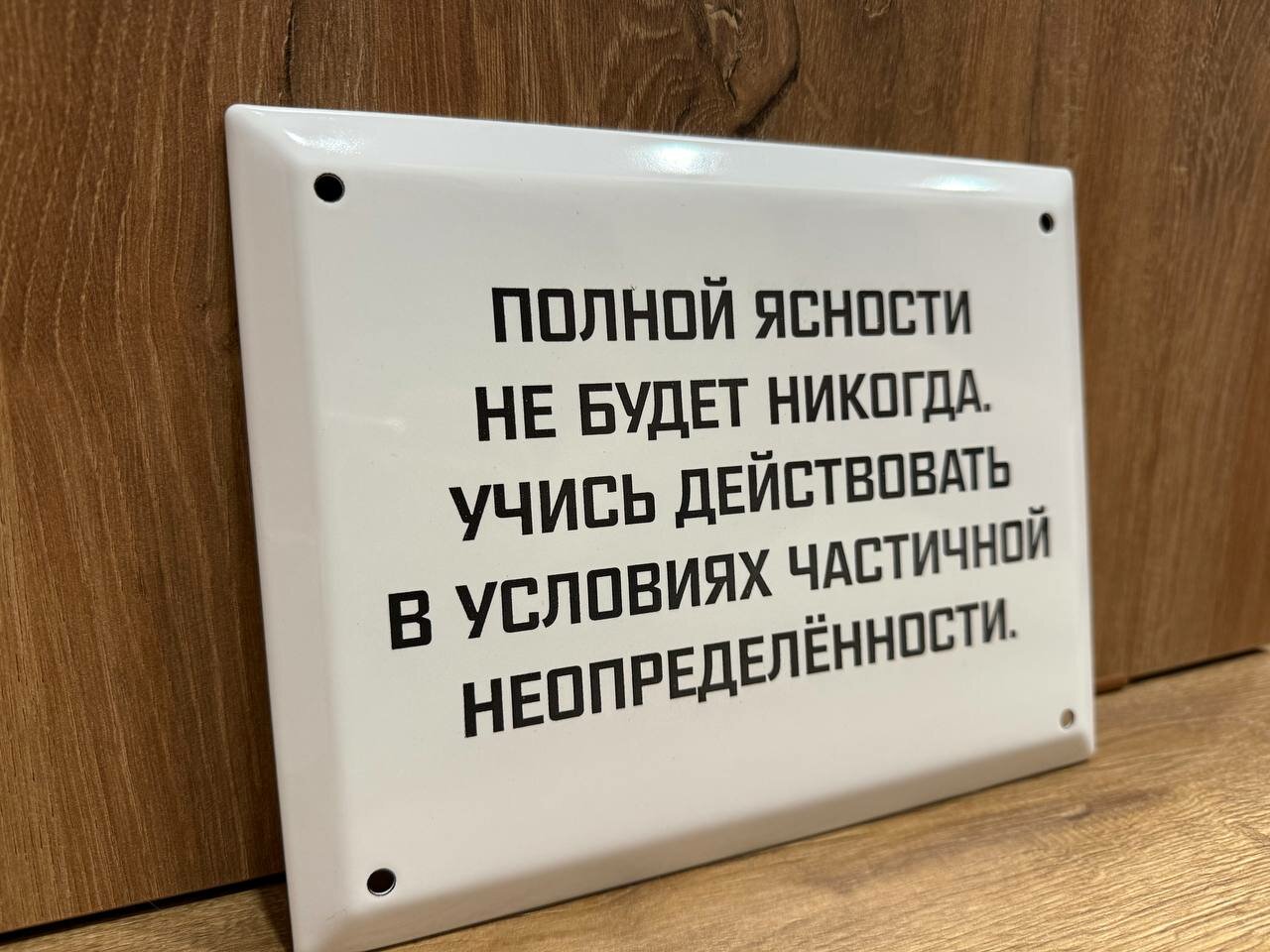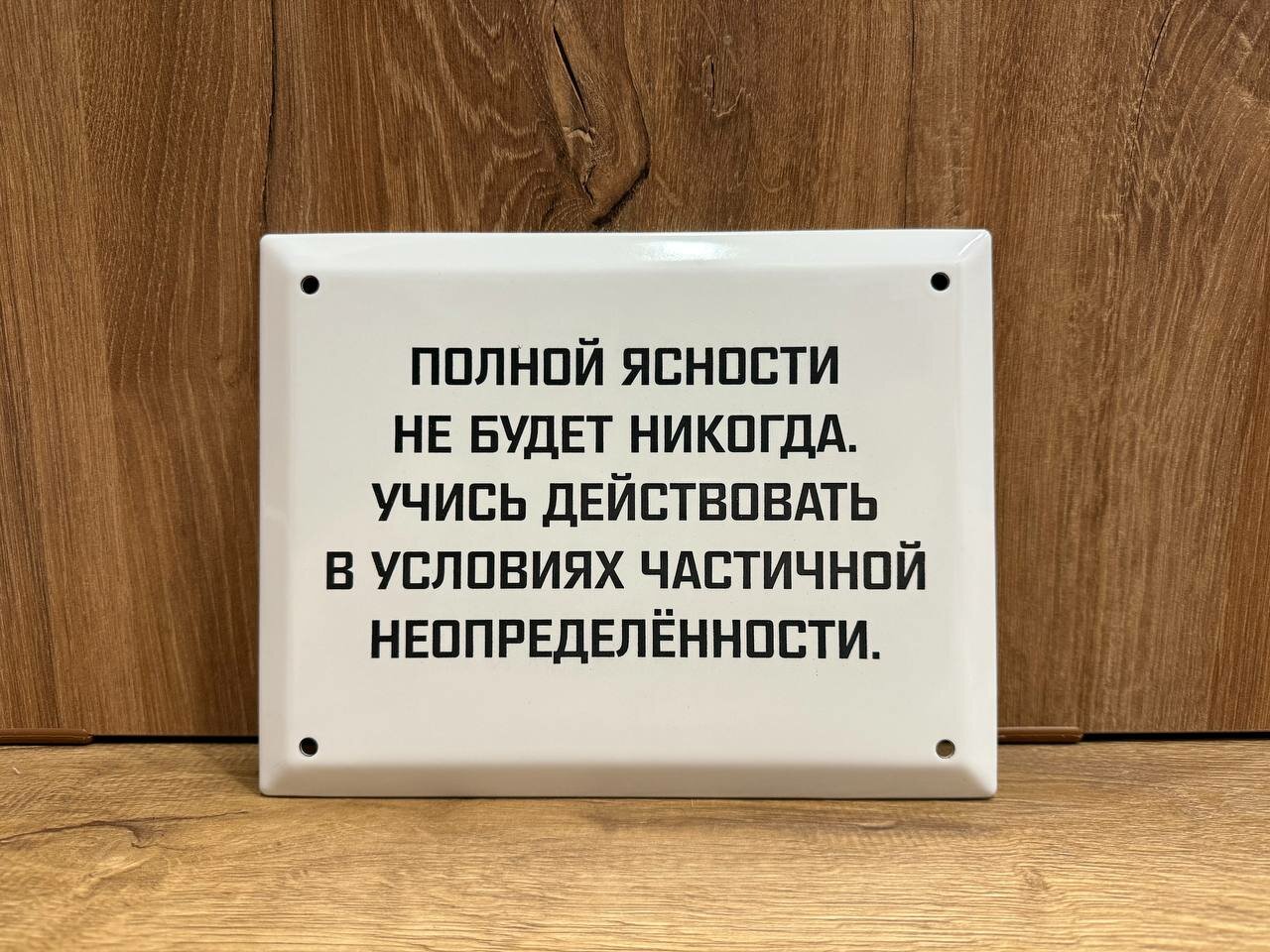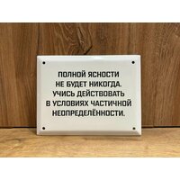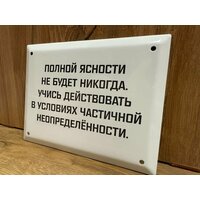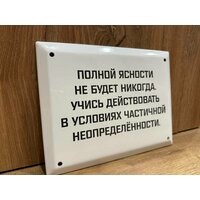 Табличка "Полной ясности не будет никогда" в стиле СССР. Табличка выполнена в стиле СССР 50-70х годов, что придает ей особую атмосферу и колорит. Она станет отличным подарком для друга, товарища или партнера, а также прекрасным дополнением к интерьеру на даче, квартире или на работе. Табличка изготовлена из металла, покрытого эмалью, что обеспечивает ей прочность и долговечность. Размер изделия составляет 18*23.5 см, что делает его компактным и удобным для размещения в любом месте. Табличка "Полной ясности не будет никогда" в стиле СССР станет ярким и запоминающимся элементом вашего интерьера, а также отличным подарком для любителей истории и ретро-стиля.