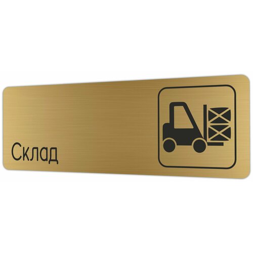 Табличка Склад из золотистого пластика с царапанной текстурой размером 30х10 см. На обратной стороне таблички - двусторонняя клейкая лента для монтажа таблички без сверления. Текст и пиктограмма на табличку наносятся методом гравировки, такм образом изображение на табличке не будет сдираться, а также устойчиво к выгоранию и механическим повреждениям. При необходимости табличку можно протирать влажной тряпкой или салфетками. Табличка с гравировкой с надписью Склад имеет сертификат ГОСТ и изготовлена из материалов не поддерживающих горение