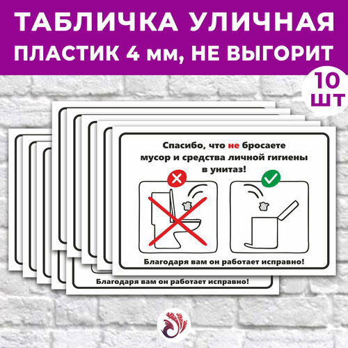 Табличка «Спасибо, что не бросаете мусор и средства личной гигиены в унитаз!», 45х30см, пластик 4мм, 10 шт.: сравнение цен, характеристики, фото, актуальное наличие и цены.