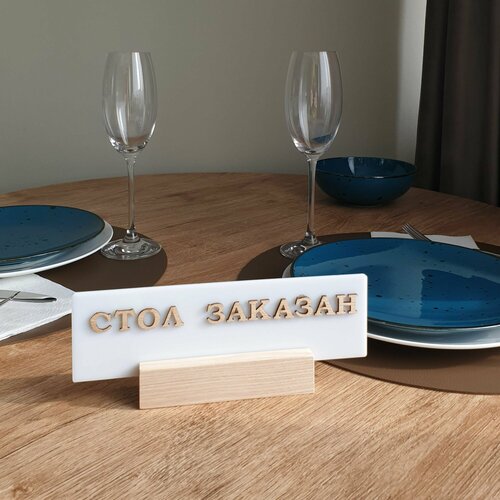 Стильная табличка Reserved, информирующая о занятости столика в кафе или ресторане. Стильная, качественная табличка резерв сразу даст понять гостям, что у вас придерживаются самых высоких стандартов обслуживания. Основание таблички и объемные буквы выполнены из массива ясеня. Декоративным элементом служит пластик. Благодаря сочетанию ясеня и искусственных материалов табличка на стол резерв смотрится стильно и оригинально. Табличка для размещения отлично подойдет для столиков кафе или ресторанов. Прекрасно вписывается в современный дизайн интерьера. Деревянное основание сочетается с вырезанными объемными деревянными буквами.