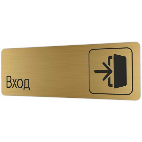 Табличка Вход из золотистого пластика с царапанной текстурой размером 30х10 см. На обратной стороне таблички - двусторонняя клейкая лента для монтажа таблички без сверления. Текст и пиктограмма на табличку наносятся методом гравировки, такм образом изображение на табличке не будет сдираться, а также устойчиво к выгоранию и механическим повреждениям. При необходимости табличку можно протирать влажной тряпкой или салфетками. Табличка с гравировкой с надписью Вход имеет сертификат ГОСТ и изготовлена из материалов не поддерживающих горение