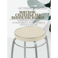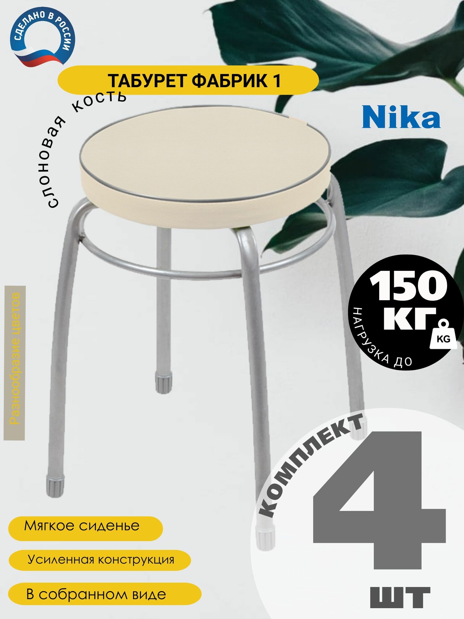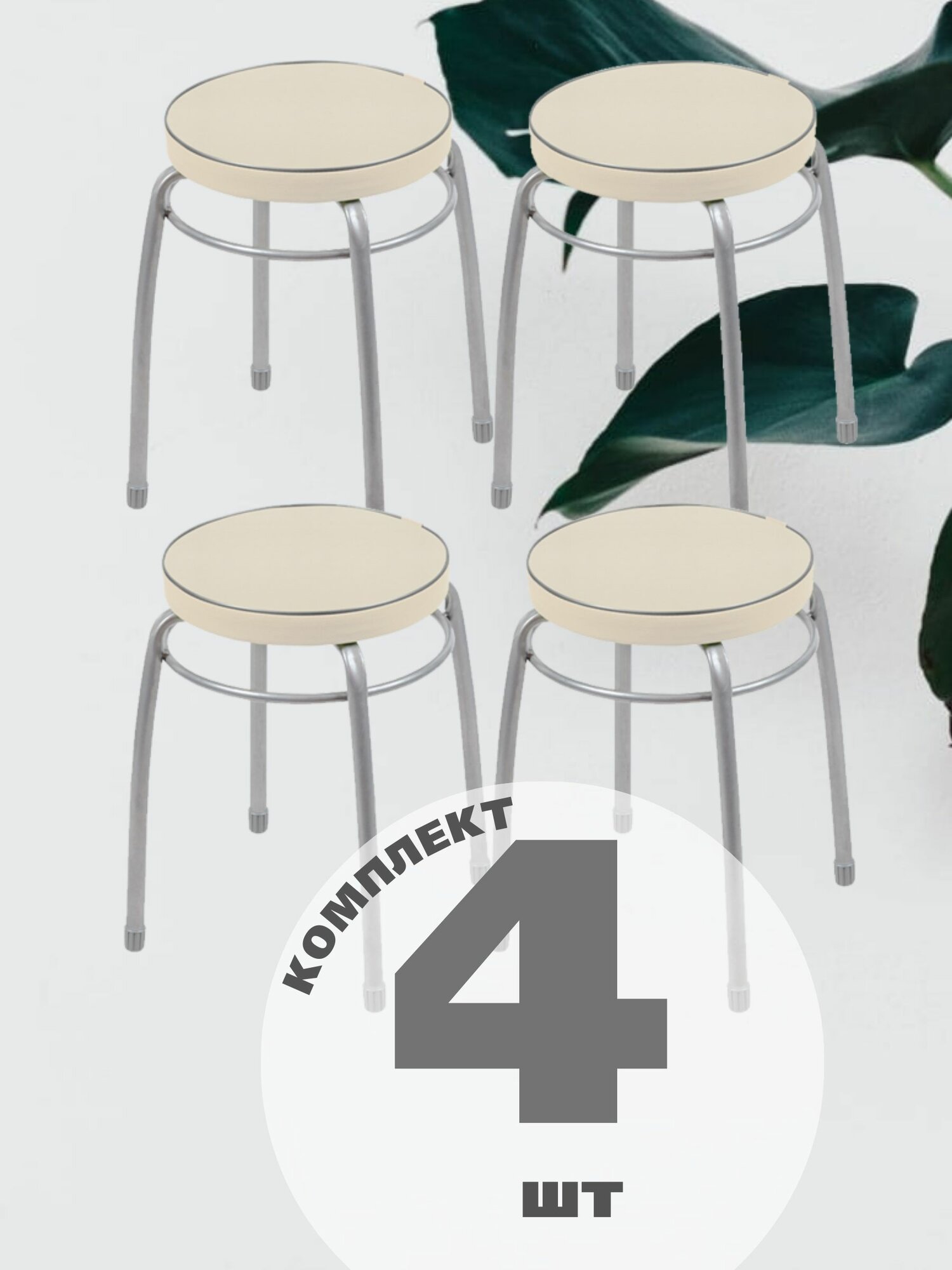 Табурет на четырех опорах с мягким сиденьем из винилискожи. Материал сиденья устойчивый к истиранию и лёгкий в чистке. Пластиковые колпачки на ножках защищают поверхность пола от царапин. Конструкция стула позволяет легко штабелировать несколько изделий.