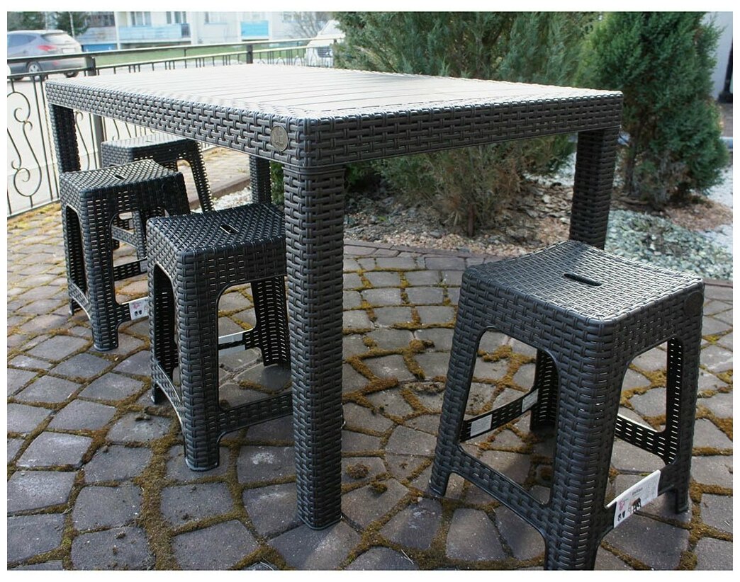 цвет горький шоколад, материал рифленый пластик с плетеной текстурой, открытый верх с круглым отверстием в центре, четыре прямые ножки, предназначен для использования на улице