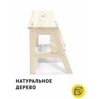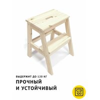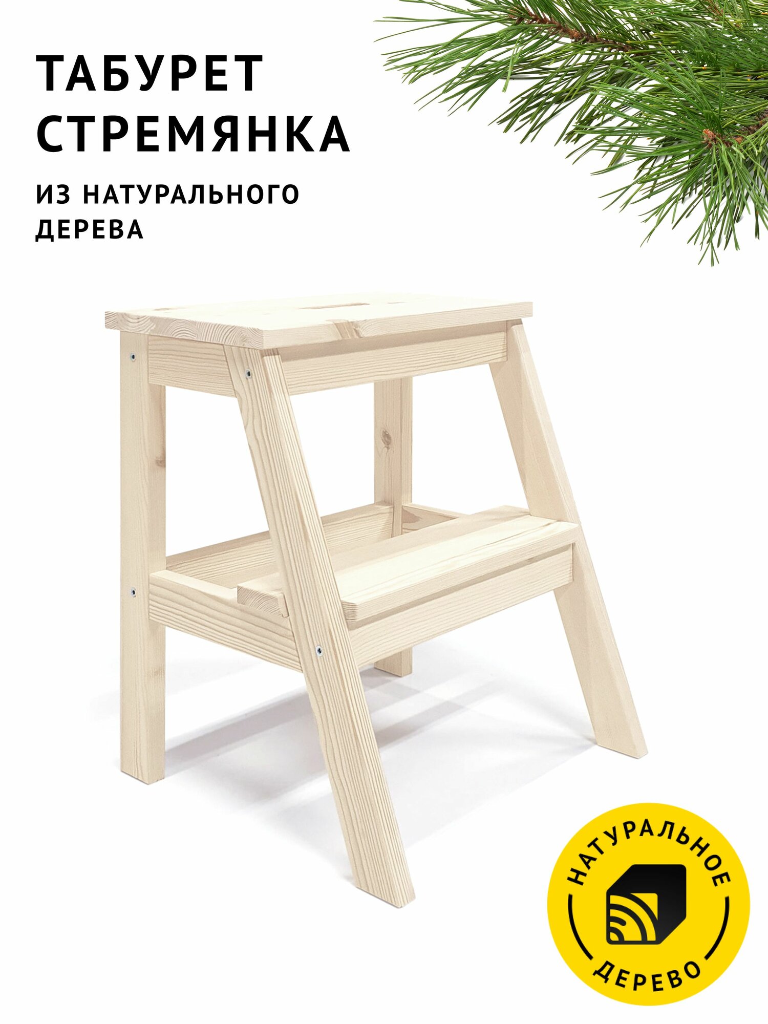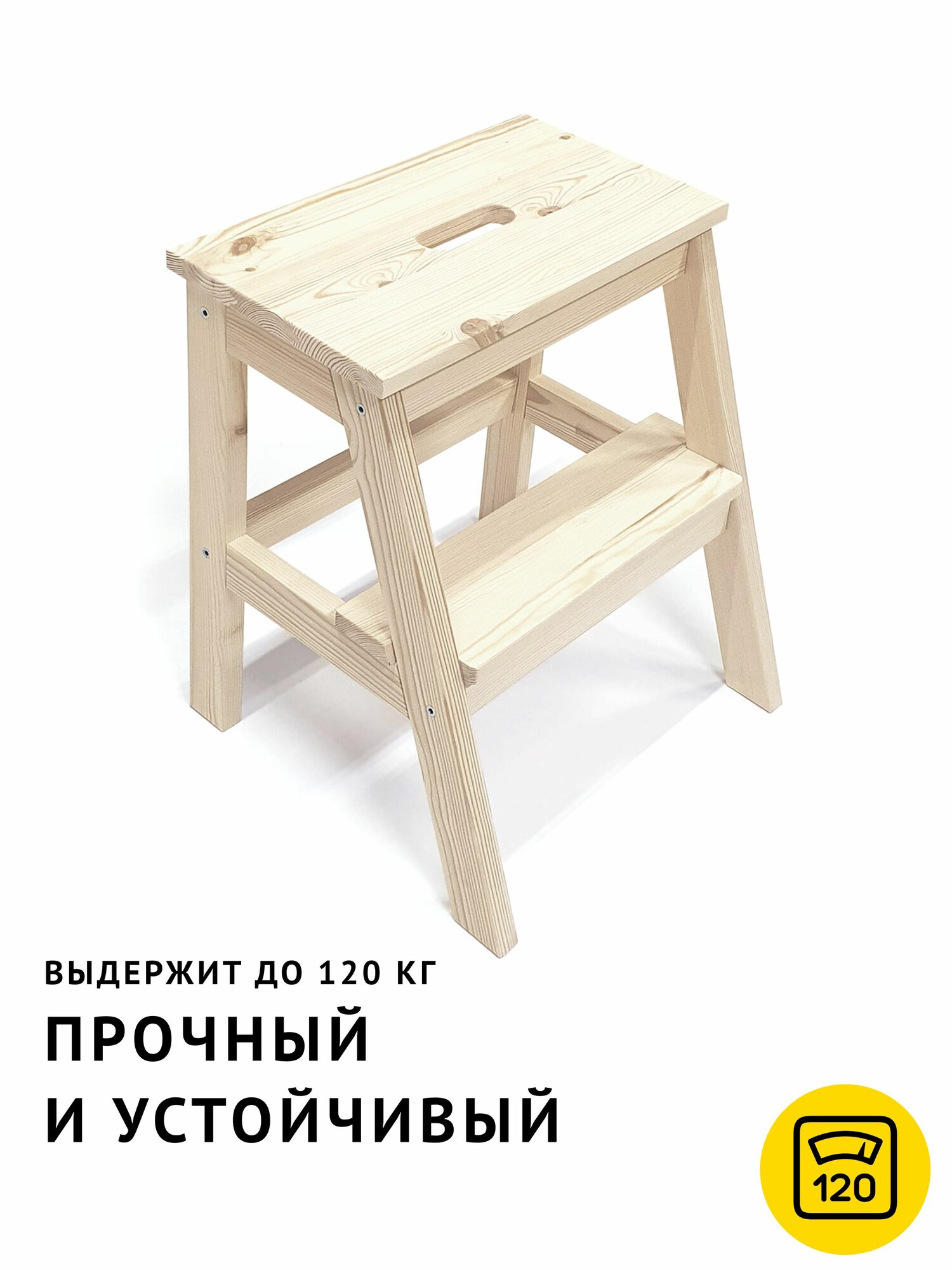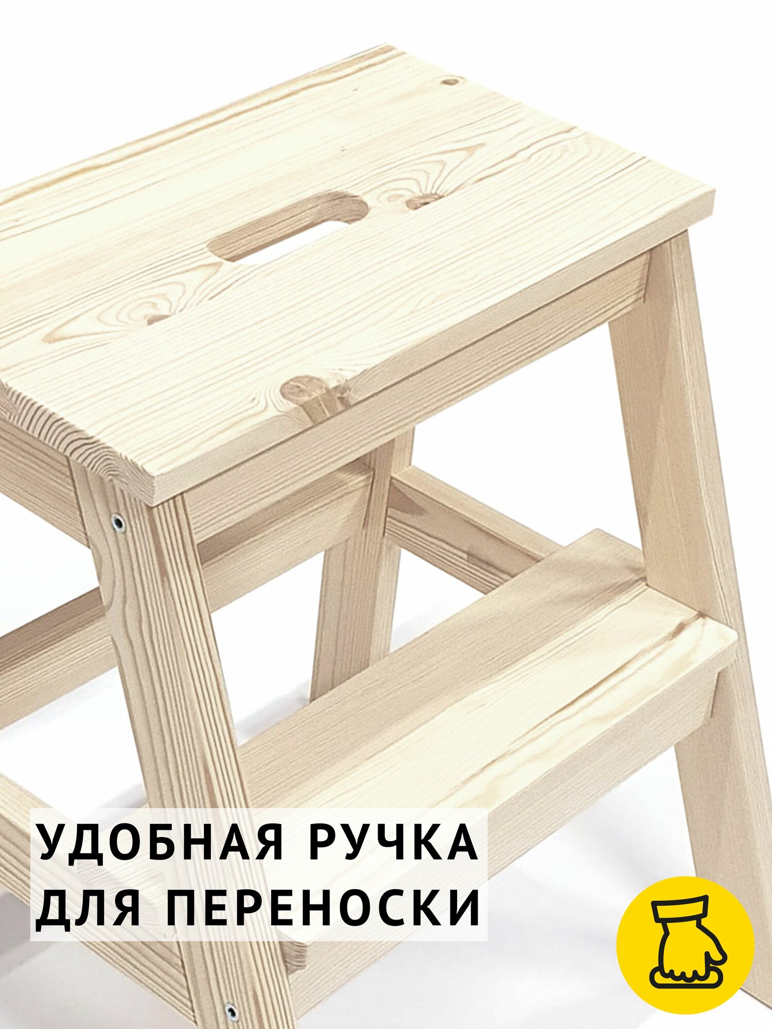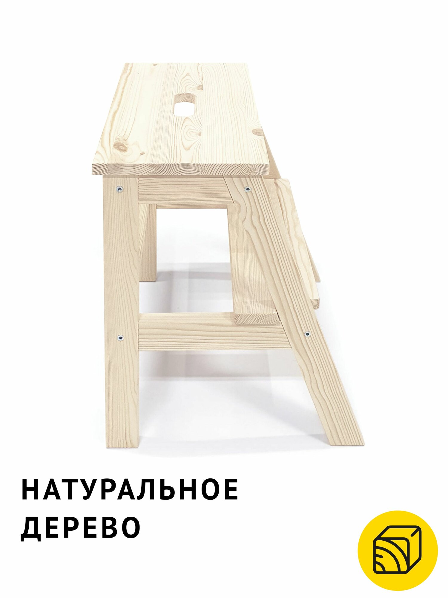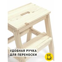 Табурет-стремянка изготовлен из натурального дерева. Массив хвойных пород дерева – износостойкий натуральный материал. Благодаря отверстию в верхней ступеньке табурет-лестницу легко перемещать.