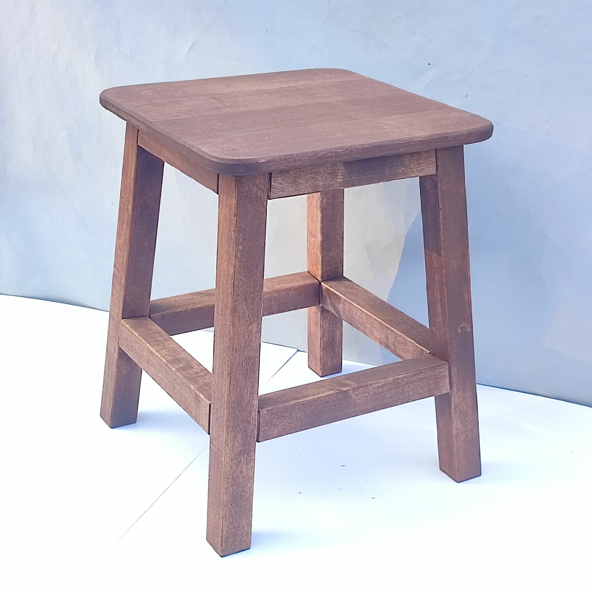 Табурет из массива березы на косых ножках. Высота табурета 46 см, увеличенный размер сиденья 36х36 см, толщина сиденья 17мм. Ножки и царги сечением 4х4 см. Пропитан профессиональным колерованным масло-воском, цвет палисандр.