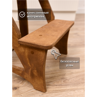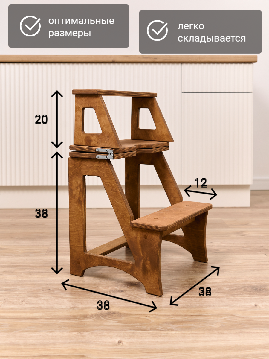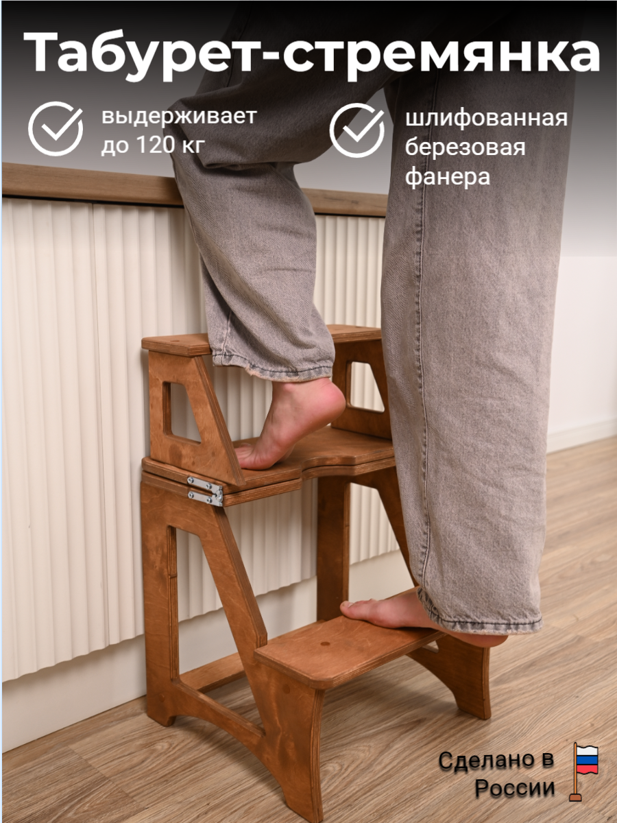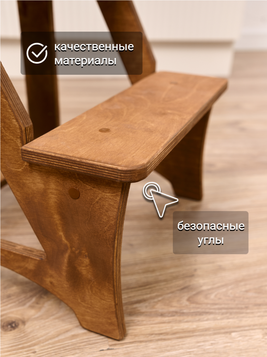 Конструкция деревянного стульчика продумана до мелочей: специально спрятанные головки евровинтов (конфирматов), не будут цепляться за вещи и мешать при эксплуатации мебели. Мини стремянка из березы — качественное сиденье из натурального материала, которое упростит жизнь взрослым, пожилым и детям. Изделие станет полезным подарком маме, папе, бабушке, дедушке или ребенку на любой случай жизни. Табурет для кухни и ванной комнаты — это симбиоз удобства и стиля, который станет незаменимым атрибутом в вашем доме. Добавляйте уюта, правильно организовывайте пространство и улучшайте качество работы при помощи универсального и многофункционального табурета!