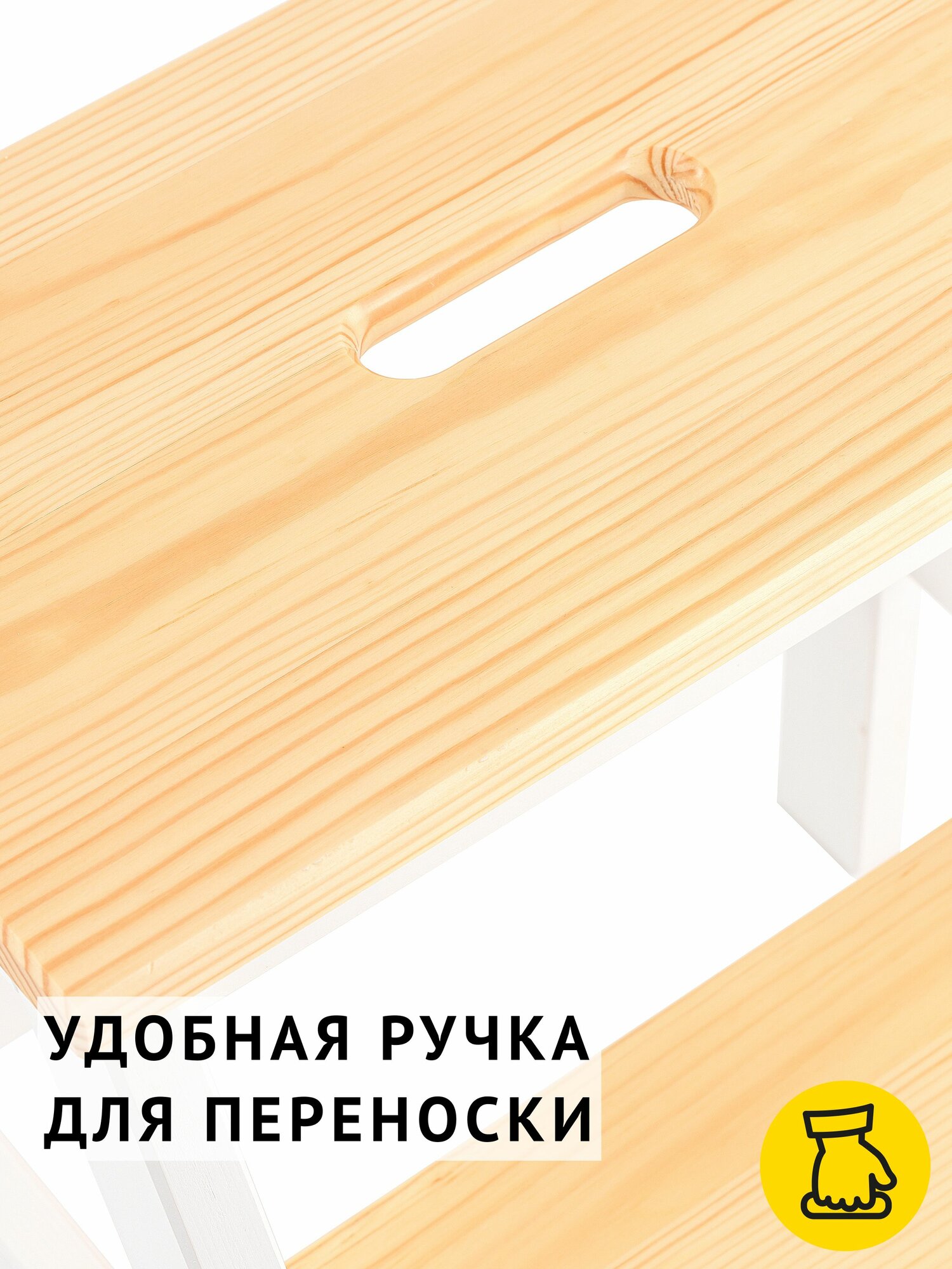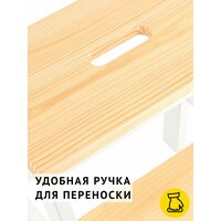 Табурет-стремянка изготовлен из натурального дерева. Массив хвойных пород дерева – износостойкий натуральный материал. Благодаря отверстию в верхней ступеньке табурет-лестницу легко перемещать.