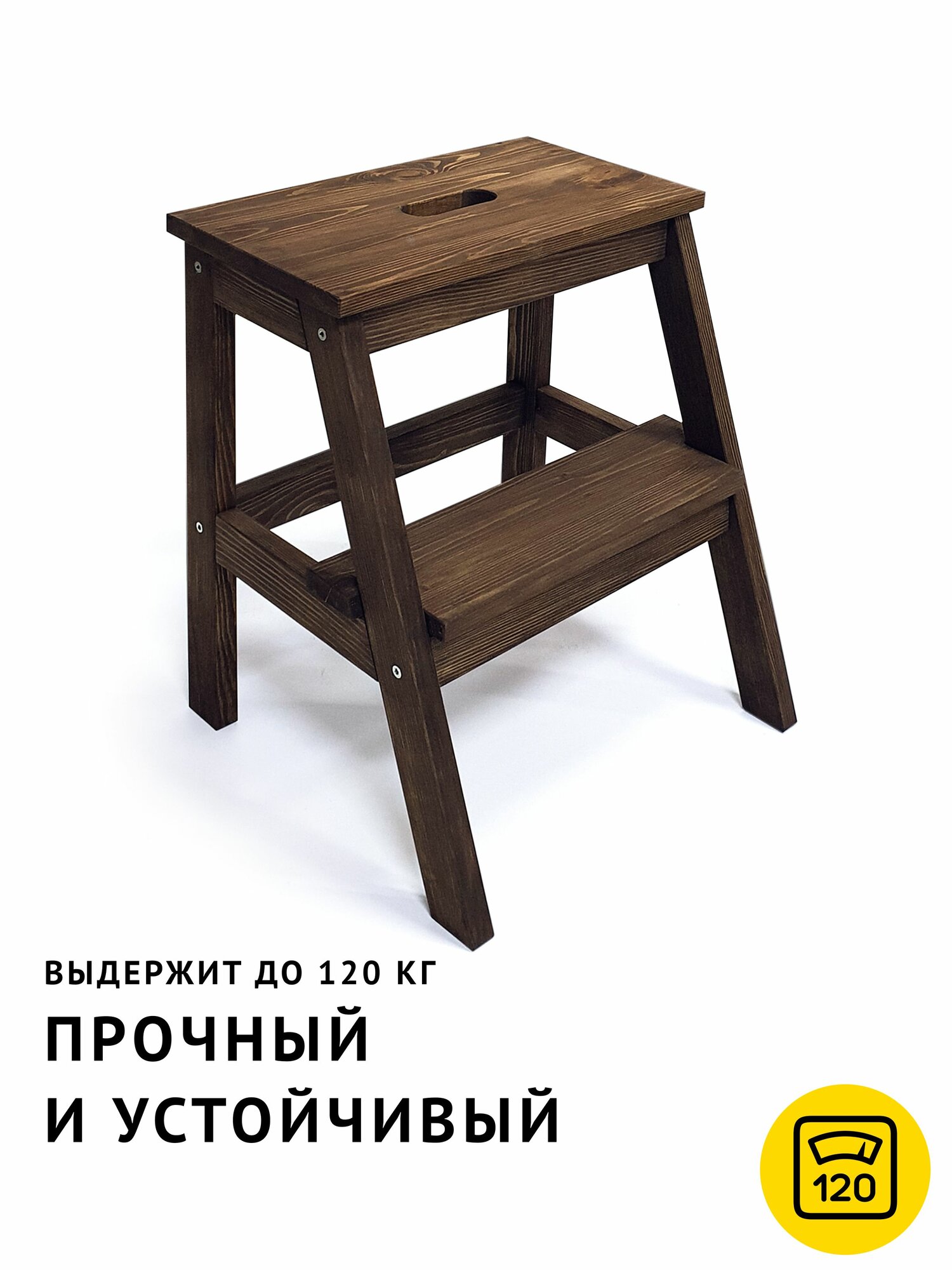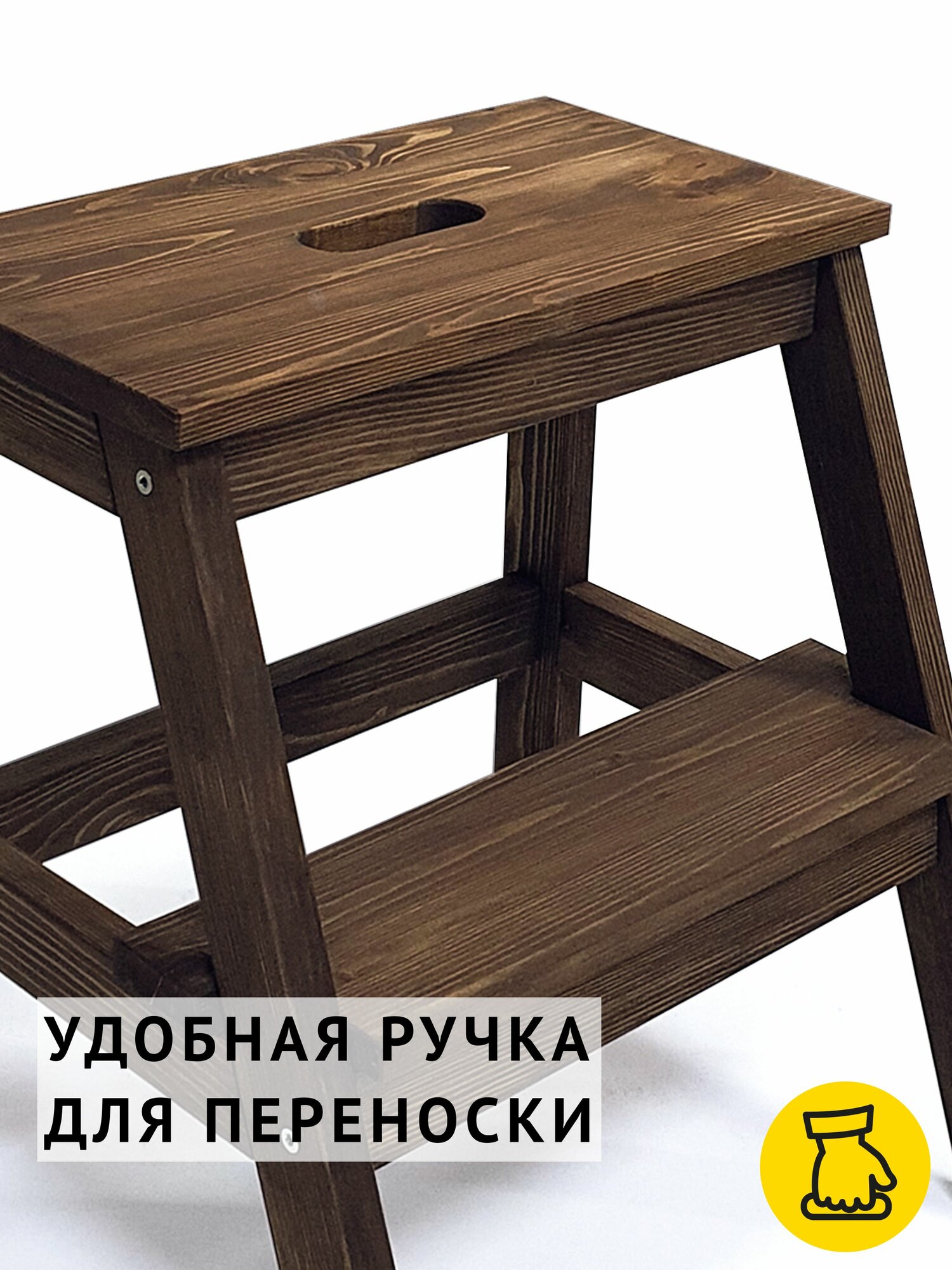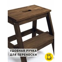 Табурет-стремянка изготовлен из натурального дерева. Массив хвойных пород дерева – износостойкий натуральный материал. Благодаря отверстию в верхней ступеньке табурет-лестницу легко перемещать.