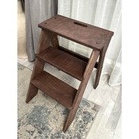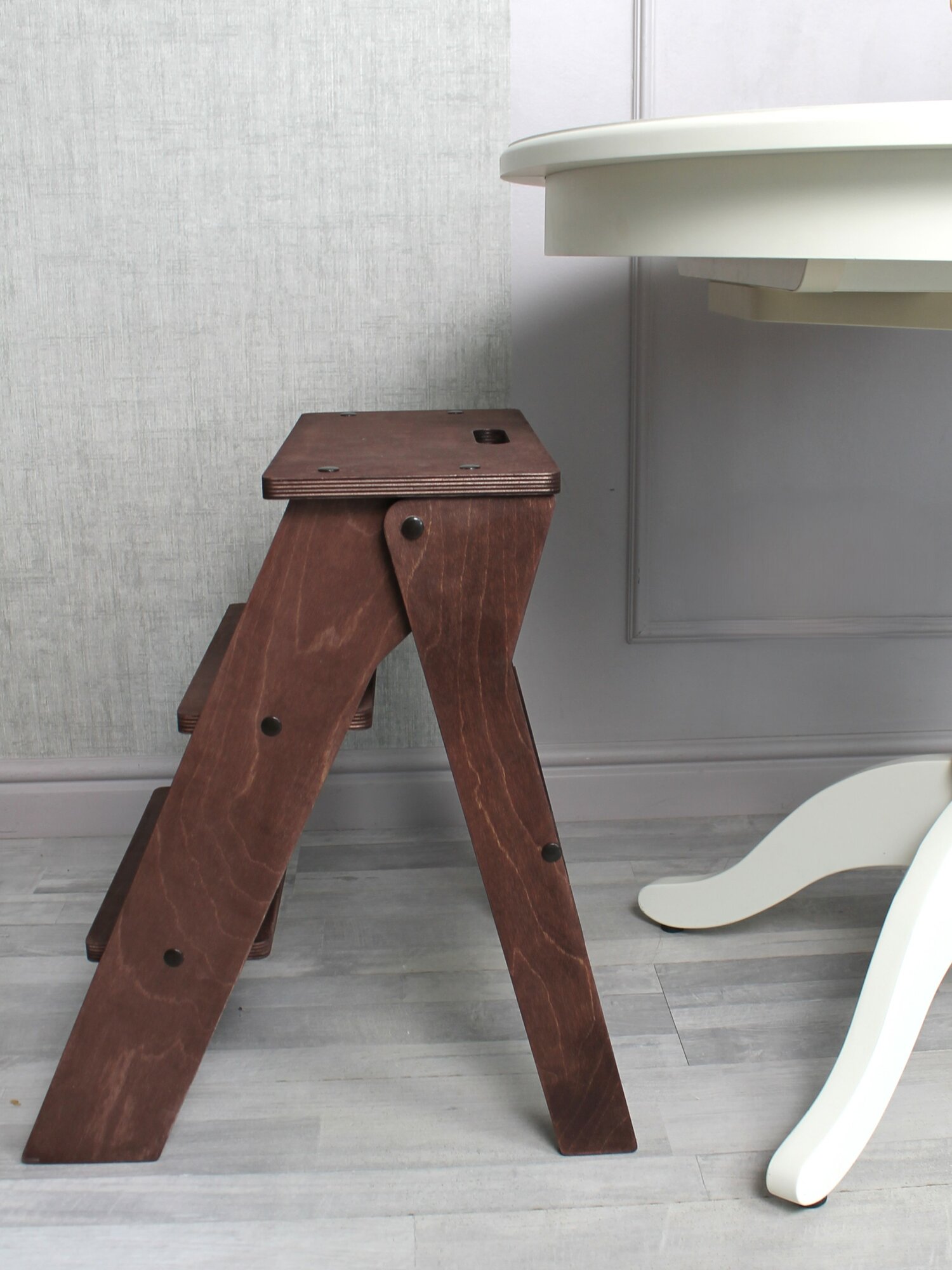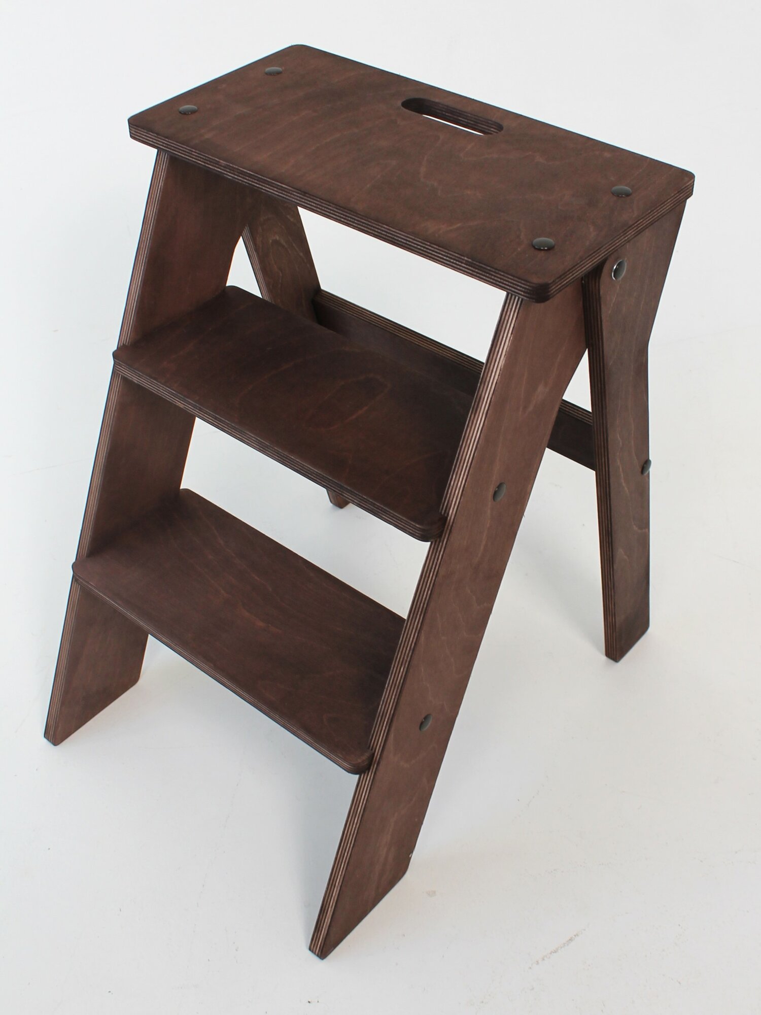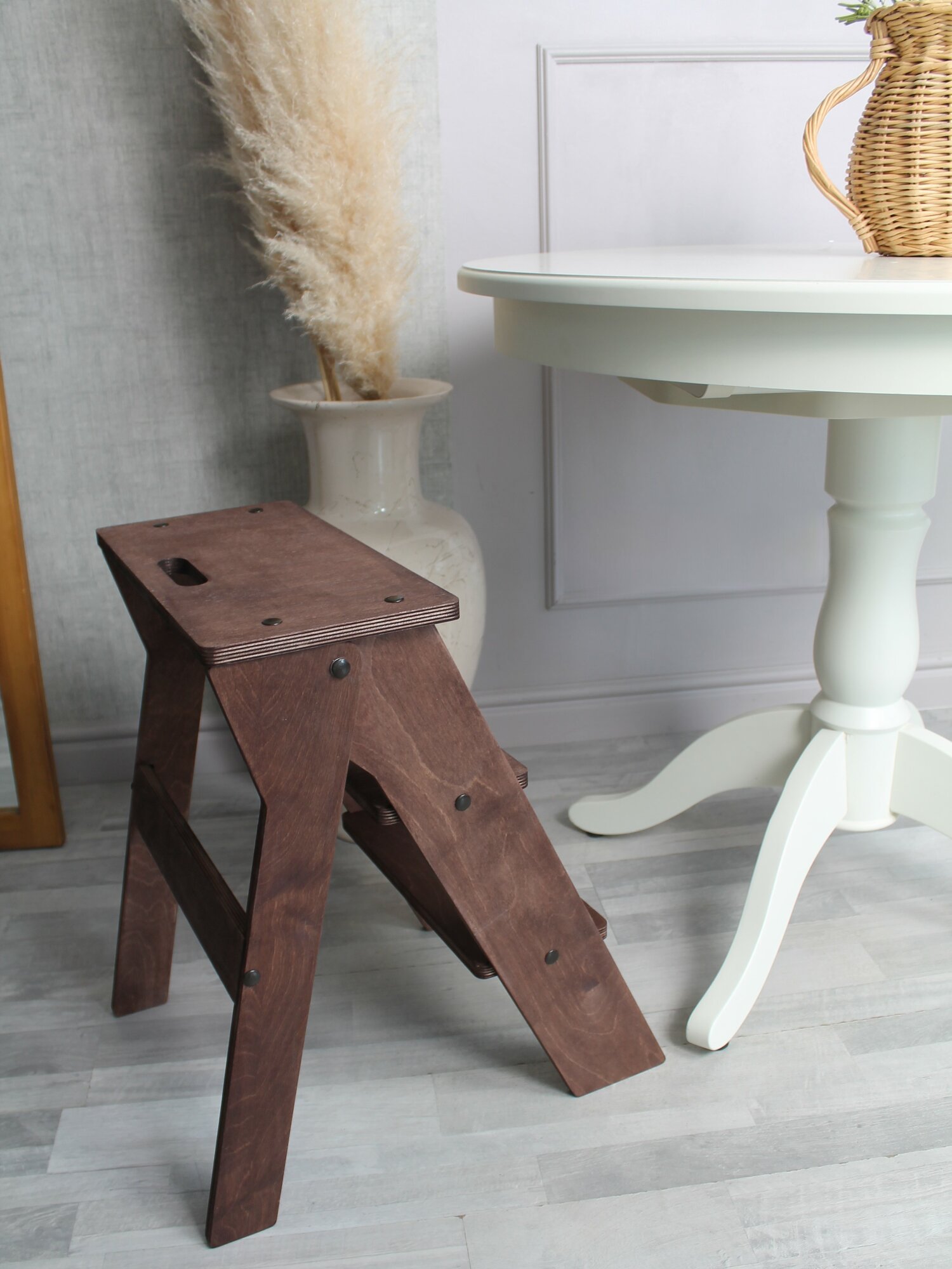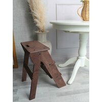 Этот маленький деревянный стул-стремянку можно легко перемещать из одного места в другое. Для удобства перемещения в сиденье предусмотрена ручка. Помимо этого, табурет со ступенькой представляет собой маленькую устойчивую лестницу для подъёма на небольшую высоту.