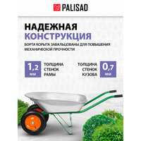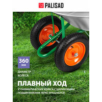 Садовая тачка Palisad 689225 с двумя колесами, грузоподъемностью 170 кг и с кузовом объемом 78 л, рассчитана на транспортировку садовых и легких строительных грузов. Избавляет от необходимости ручного перемещения тяжестей и позволяет снизить нагрузку на спину.