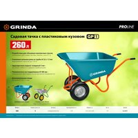 GRINDA GP-1, кузов увеличенного объема 260 л, г/п 120 кг, ударопрочный пластик, тачка садовая PROLine (422401).