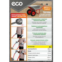 Тачка садовая двухколесная строительная ECO WB352-2 Comfort предназначена для перевозки грузов в саду и на строительной площадке. Ее максимальная грузоподъемность составляет 350 кг, что делает ее идеальным выбором для перевозки тяжелых материалов, таких как кирпичи, песок и грунт.
