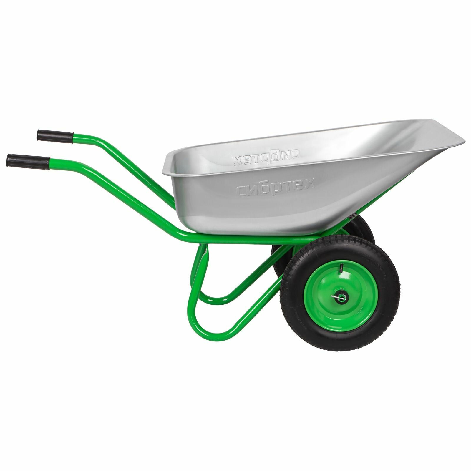 Двухколесная садово-строительная тачка Сибртех 689643 грузоподъемностью 230 кг, с объемом кузова 90 л, предназначена для перемещения грузов во время работы на строительной площадке или в саду. В ней можно перевозить грунт, щебень или строительные смеси. 2 колеса обеспечивают высокую грузоподъемность, а также устойчивость во время движения по прямой и на поворотах. Вес груза распределяется равномерно, поэтому тачка не проваливается даже в рыхлый грунт.