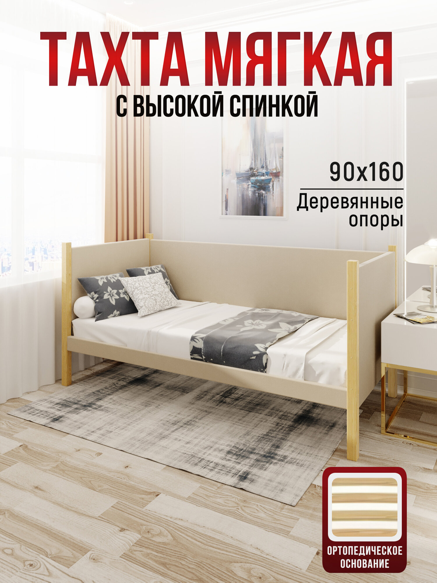 Купить Тахта односпальная из массива сосны Классика, 90х160 см, ортопедическое основание и высокие бортики с мягкой обивкой бежевого цвета, лакированные ножки с доставкой по всей России. Тахта односпальная из массива сосны Классика, 90х160 см, ортопедическое основание и высокие бортики с мягкой обивкой бежевого цвета, лакированные ножки: сравнение цен, характеристики, фото, актуальное наличие и цены.