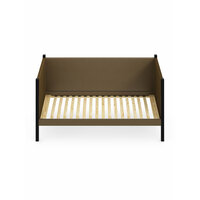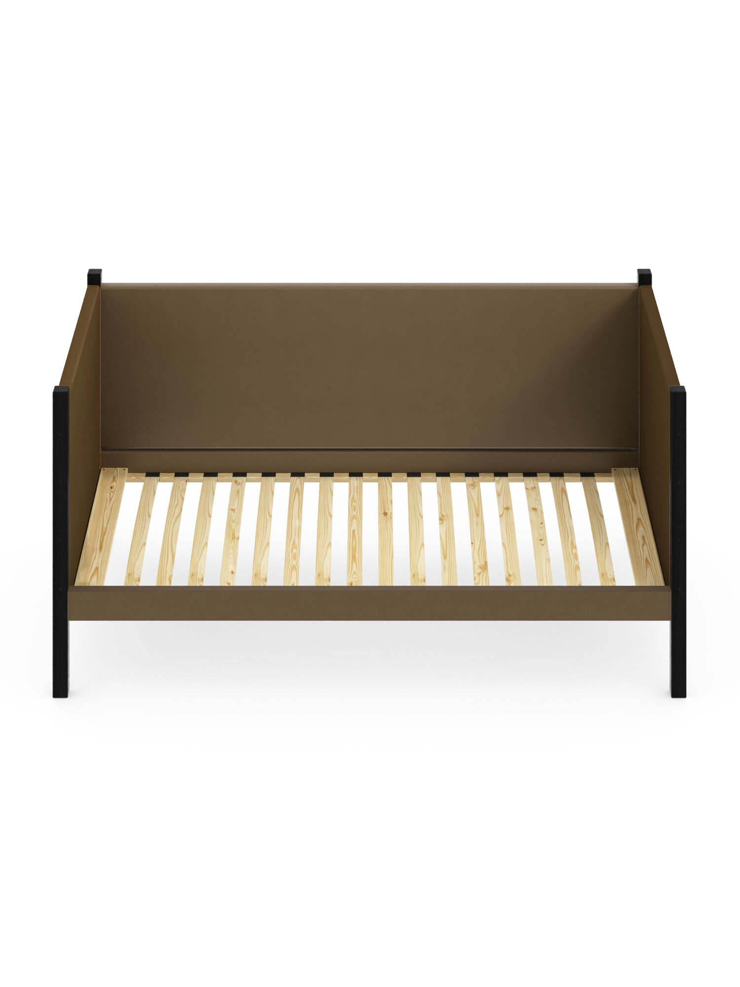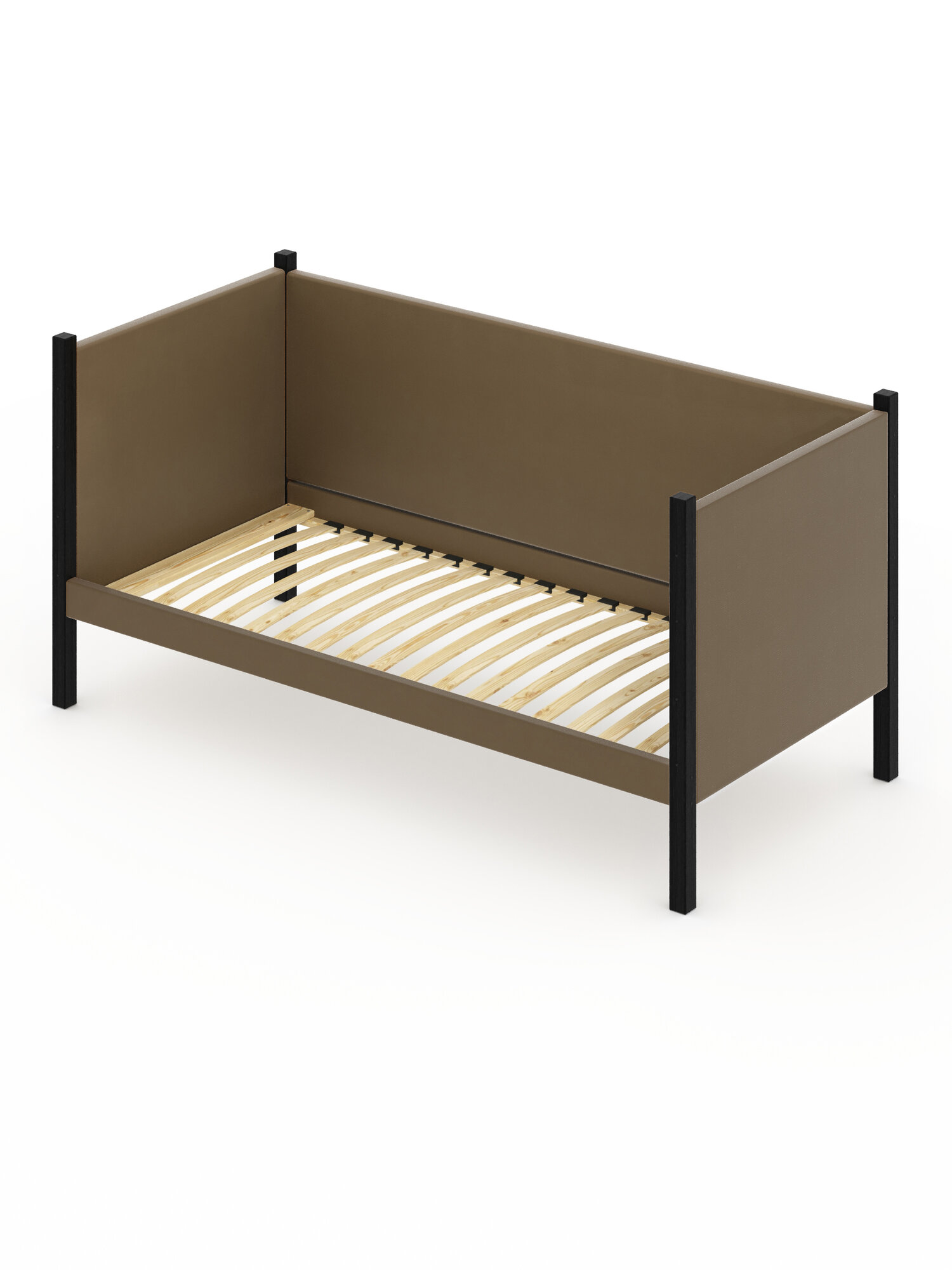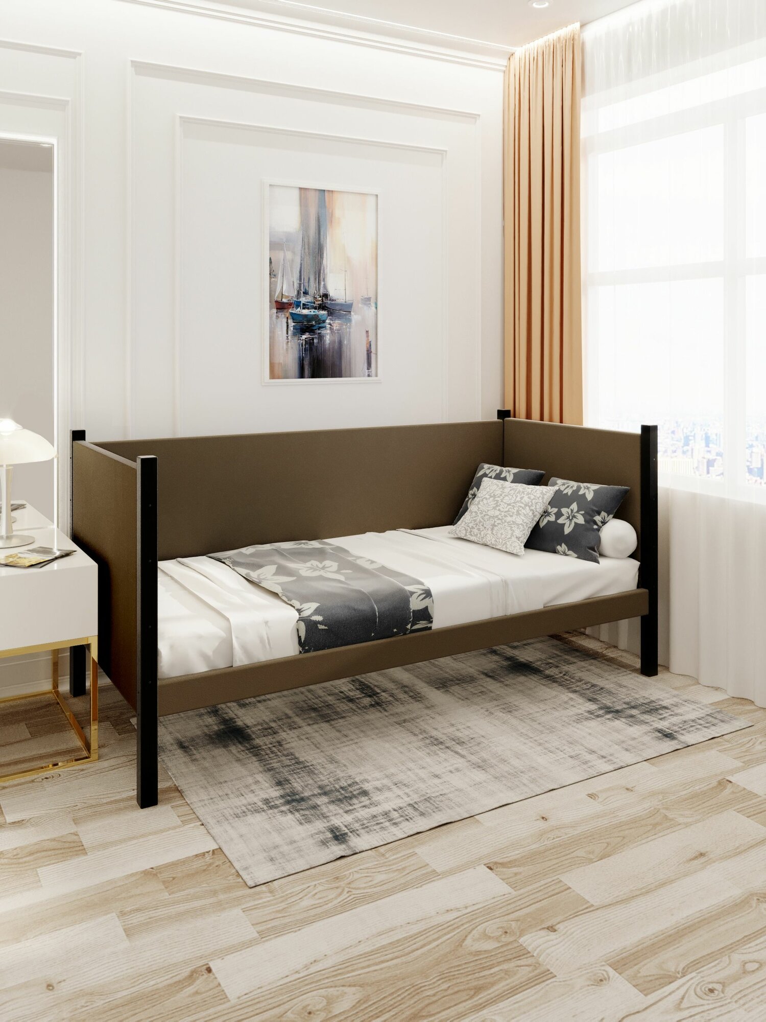 Купить Тахта односпальная из массива сосны Классика, 90х160 см, ортопедическое основание и высокие бортики с мягкой обивкой коричневого цвета, цвет ножек черный оникс с доставкой по всей России.