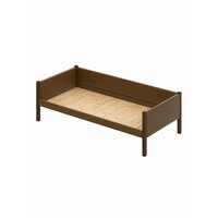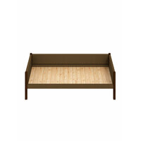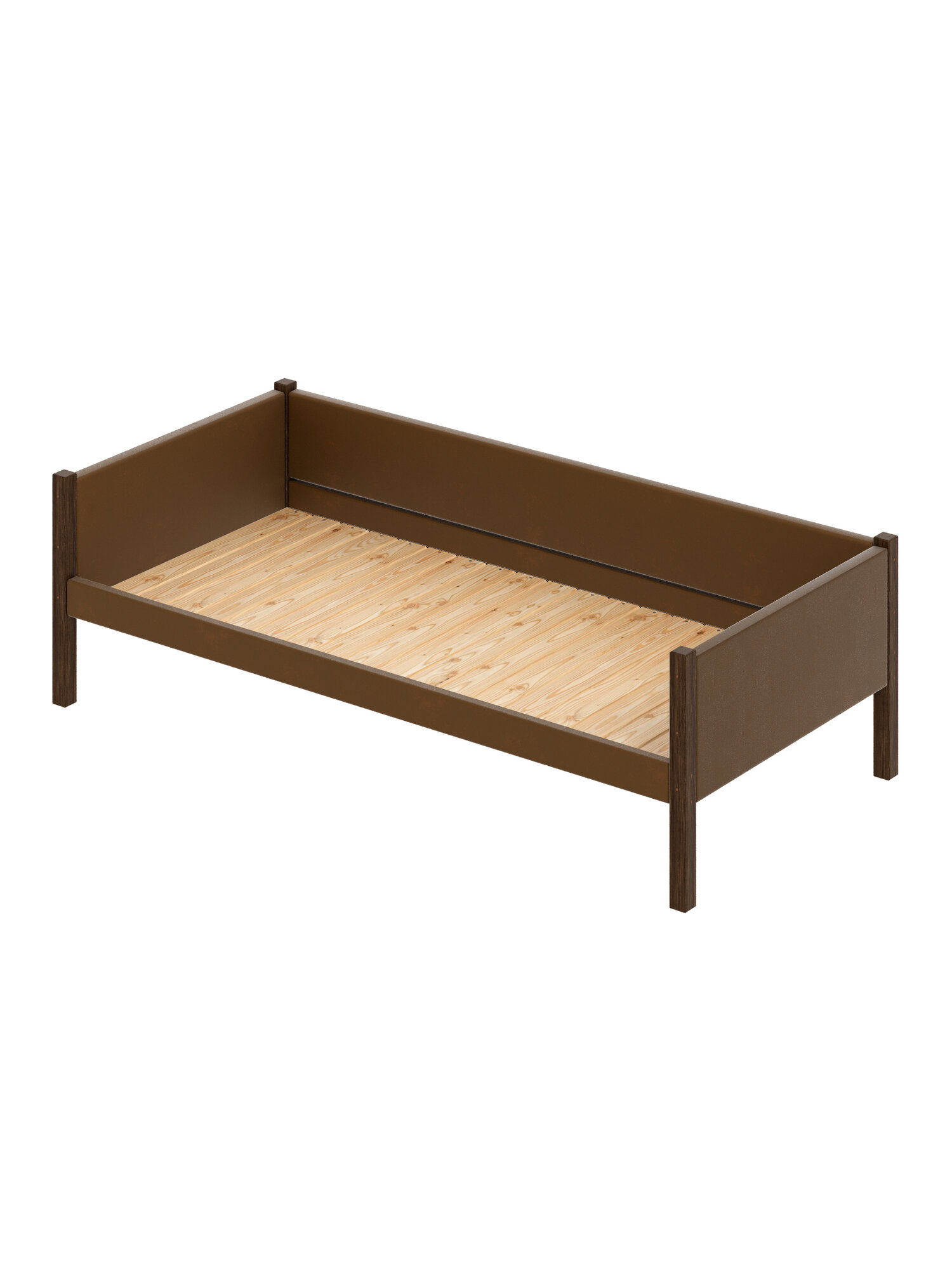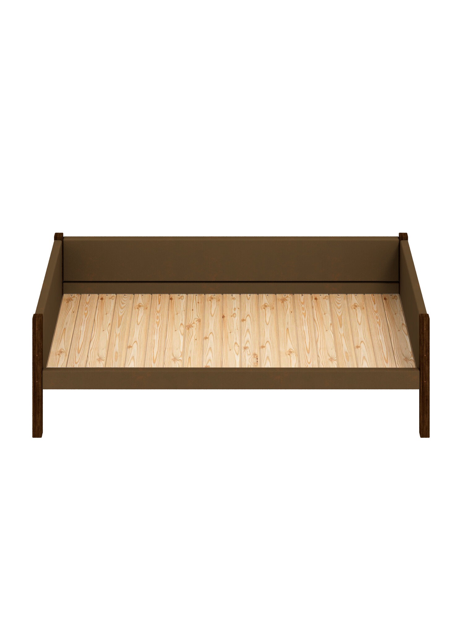 Купить Тахта односпальная Классика из массива сосны, 90х200 см, со сплошным основанием и мягкой коричневой обивкой, ножки цвета венге с доставкой по всей России.