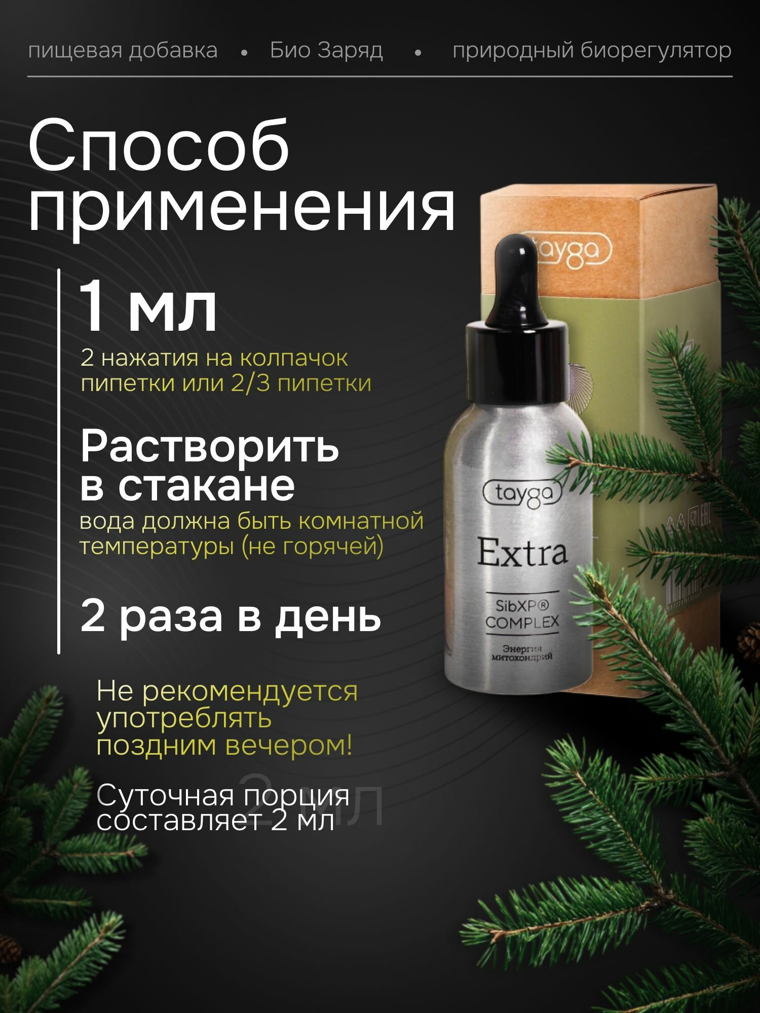 Способ применения продукта:1 мл (⅕ крышки) растворить в стакане воды комнатной температуры (НЕ горячей) два раза в день. Не рекомендуется употреблять поздним вечером. Суточная порция* T8 EXTRA 90% составляет 2 мл. *В дневной порции SibXP®Complex 1 мл клеточного сока пихты сибирской. В T8 EXTRA 90% — 2 мл.