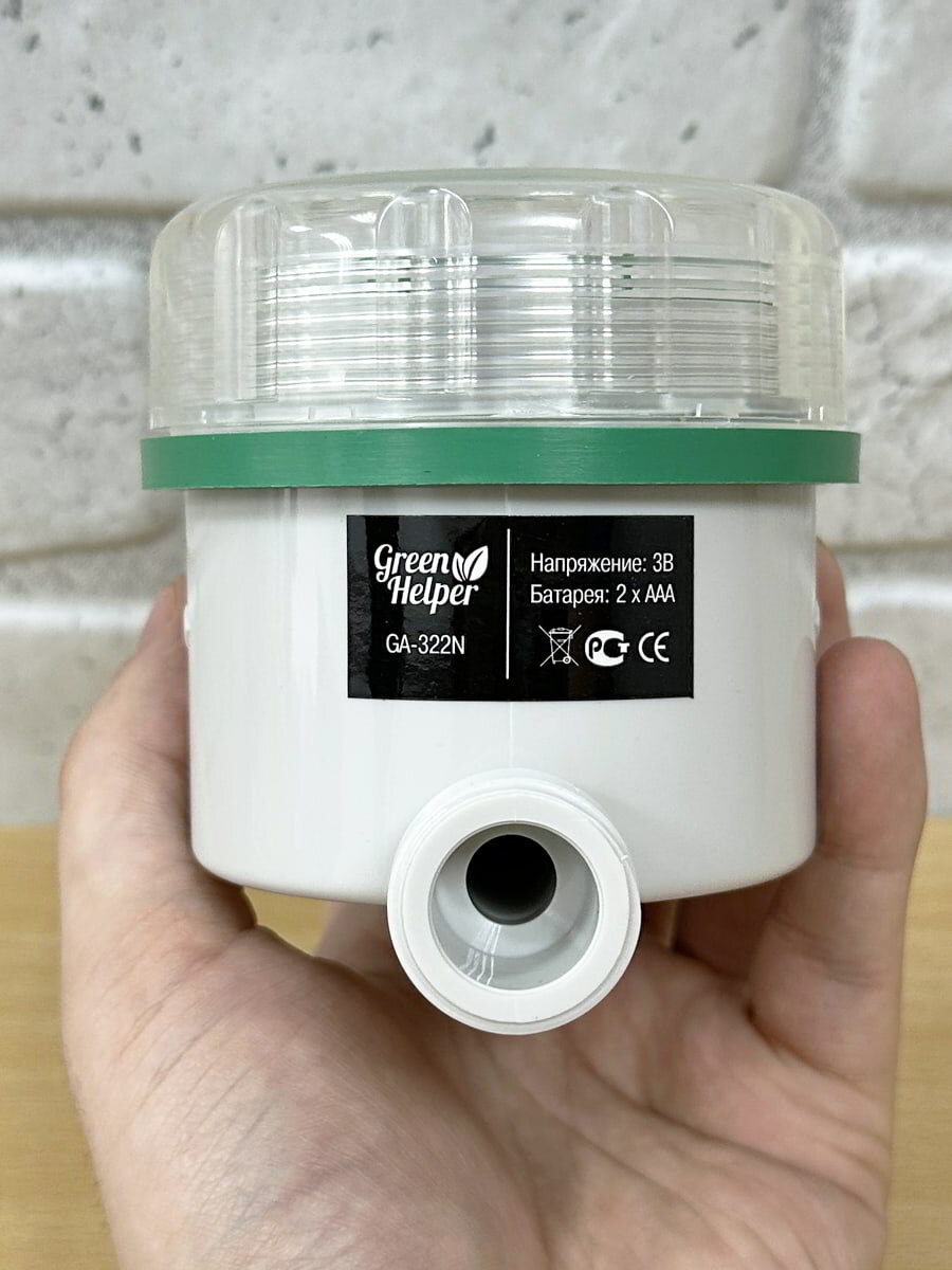 - Полностью автономное питание. Автоматический датчик Гринхелпер работает от 2-х батареек типа ААА (батареи в комплект не входят). Индикатор заряда подскажет о своевременной смене батареек.