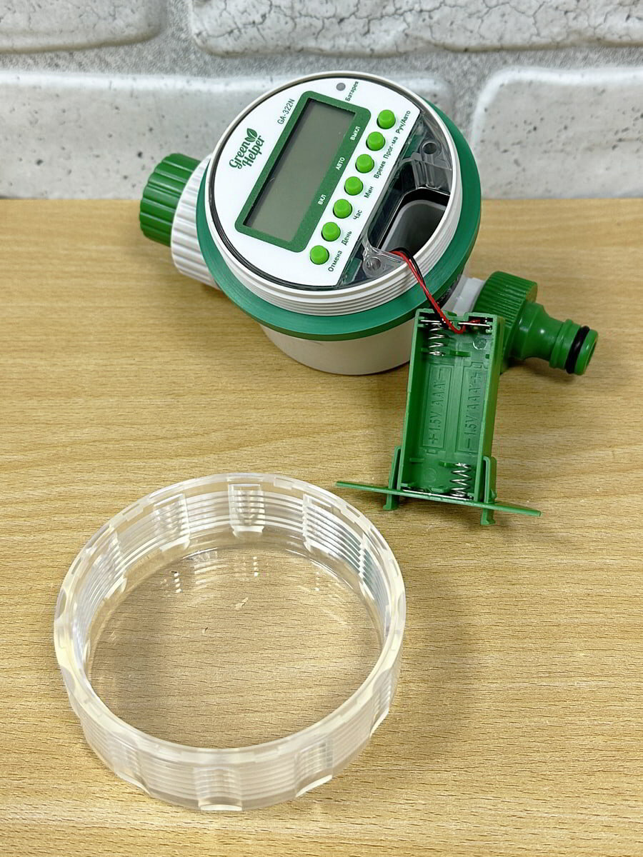Таймер Green Helper GA-322N устроен как аналоги, например, Aqualin (Аквалайн), Deko (Деко), Жук и пр. Один конец контроллера предусмотрен под водопроводный кран с наружной резьбой 3/4", другой - для подсоединения гибкого шланга (ПВХ) 1/2" под быстросъем (этот коннектор можно снять и тогда будет доступна наружная резьба 3/4").