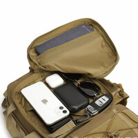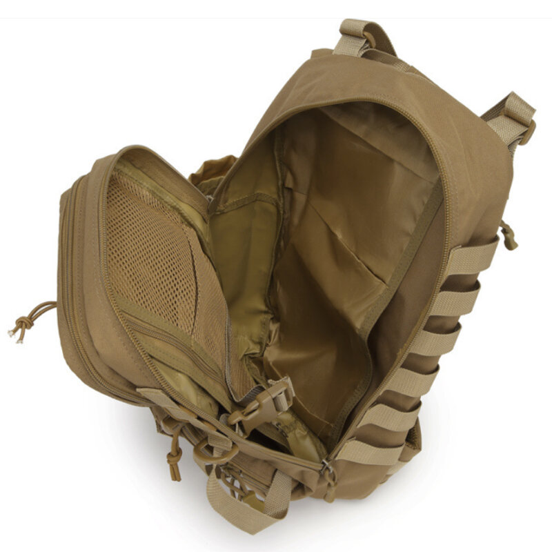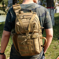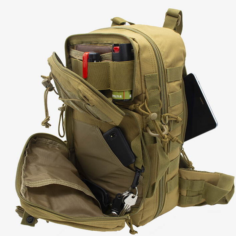 Тактический рюкзак через плечо штурм компактный, с множеством карманов и отделений. Имеет быстрый доступ к содержимому. Практичен, удобен в ношении, незаменим в тактических условиях. Материал полиэстер 800 D износостойкий с водоотталкивающей пропиткой. Верхний отсек (20*10*5 см) имеет клапан и эластичный шнур. Внутри перегородку с нашитой эластичной стропой. Нижний отсек (22*20*5 см) с двумя внутренними карманами и фиксатором для ключей. Основной отдел с внутренними карманами из нейлона сетки. Фронтальный карман на молнии фиксируется стропой на клёпке. Боковой карман для фляги с затяжкой шнуром. Спинка из сетчатой ткани с мягкой вставкой, анатомически прошита. На спинке скрытный карман на молнии. Лямка регулируется по длине спереди фиксируется дополнительной стропой при помощи фастекс. Спереди, сбоку и на лямке стропы molle. D образно кольцо, и металлический карабин для крепления дополнительного снаряжения. Имеются ручки для вертикального и горизонтального ношения. Размеры: 44×22×11 см. высота/ширина/толщина.