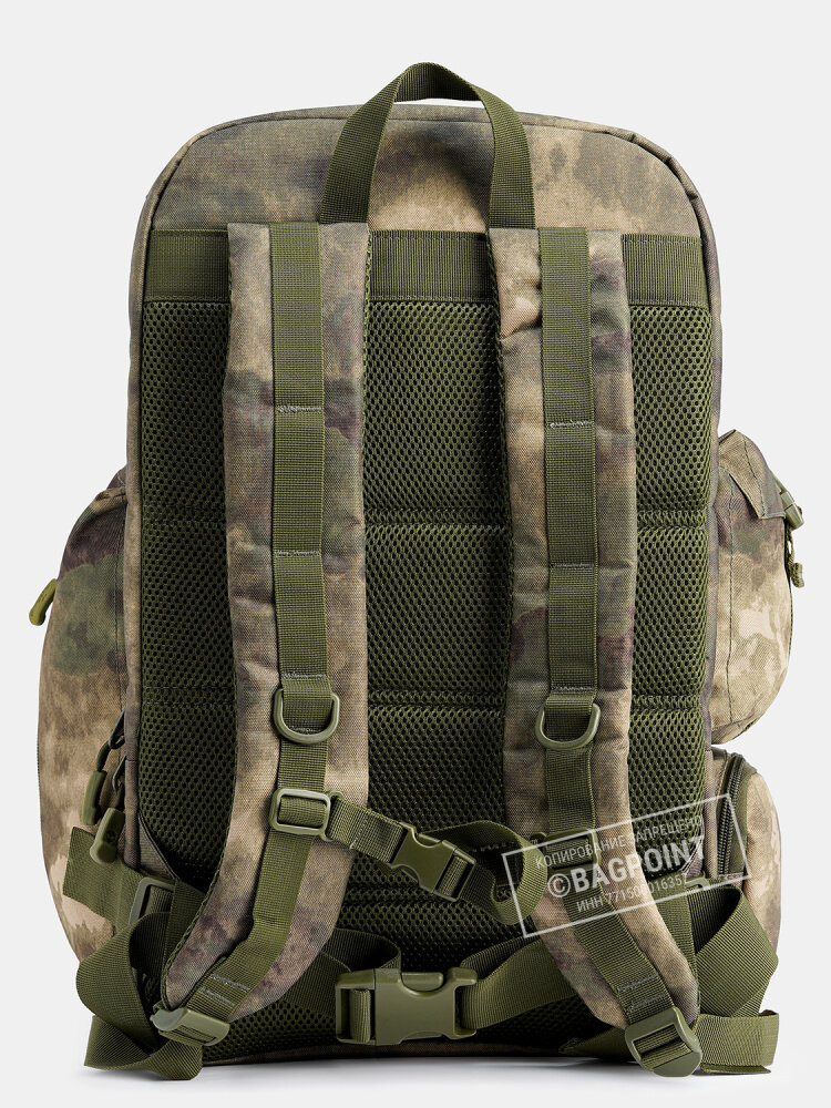 Благодаря специальным нашитым стропам (система стандарта MOLLE/PALS), к рюкзаку можно подвешивать различные подсумки (модули) под аптечку, фляжку, патроны, фотоаппарат, котелок, термос, фонарик и пр.
