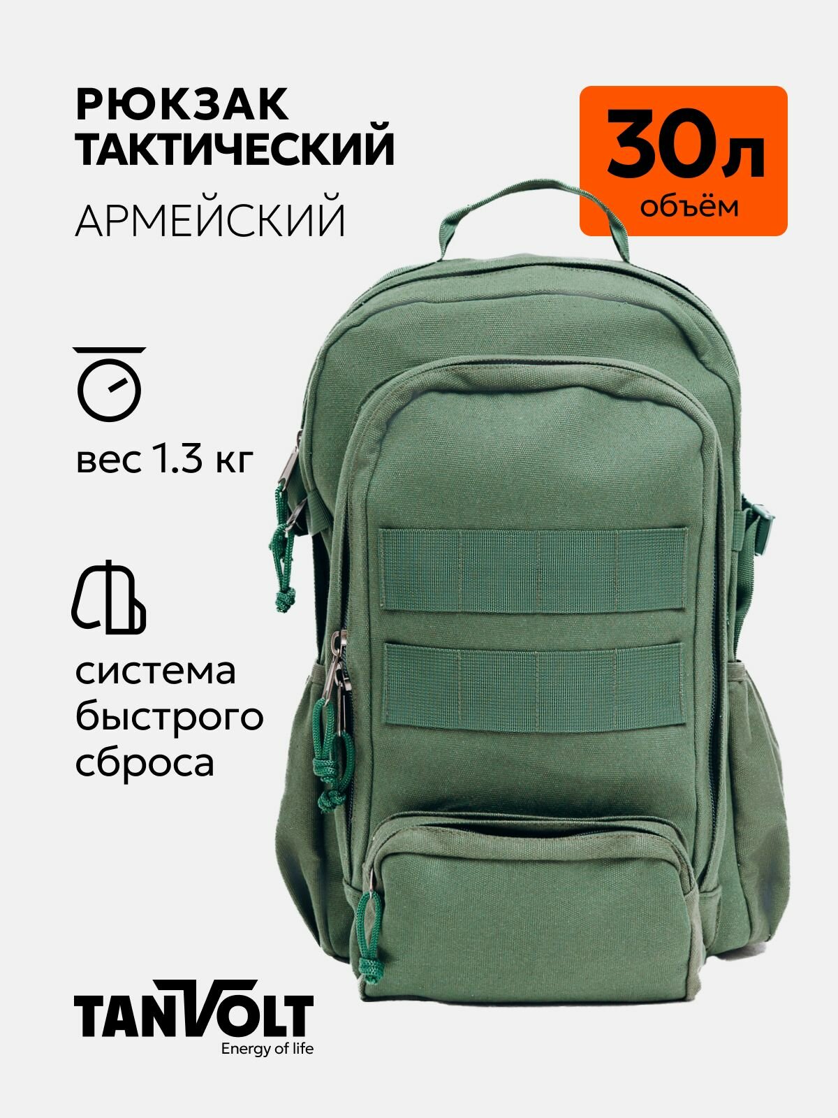 Тактический рюкзак TANVOLT 30 литров, цвет хаки — армейский, военный, походный рюкзак для охоты, рыбалки и туризма