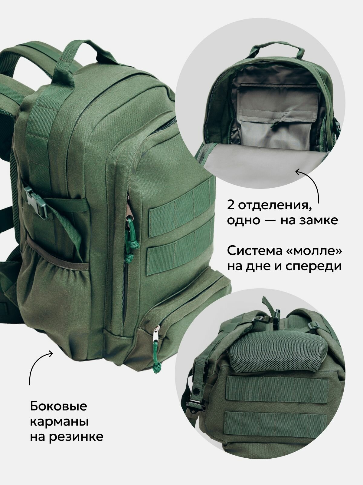 - Система MOLLE (Modular Lightweight Load-carrying Equipment) — позволяет крепить дополнительные подсумки, карманы, чехлы и аксессуары. Рюкзак легко кастомизируется под любые задачи.
