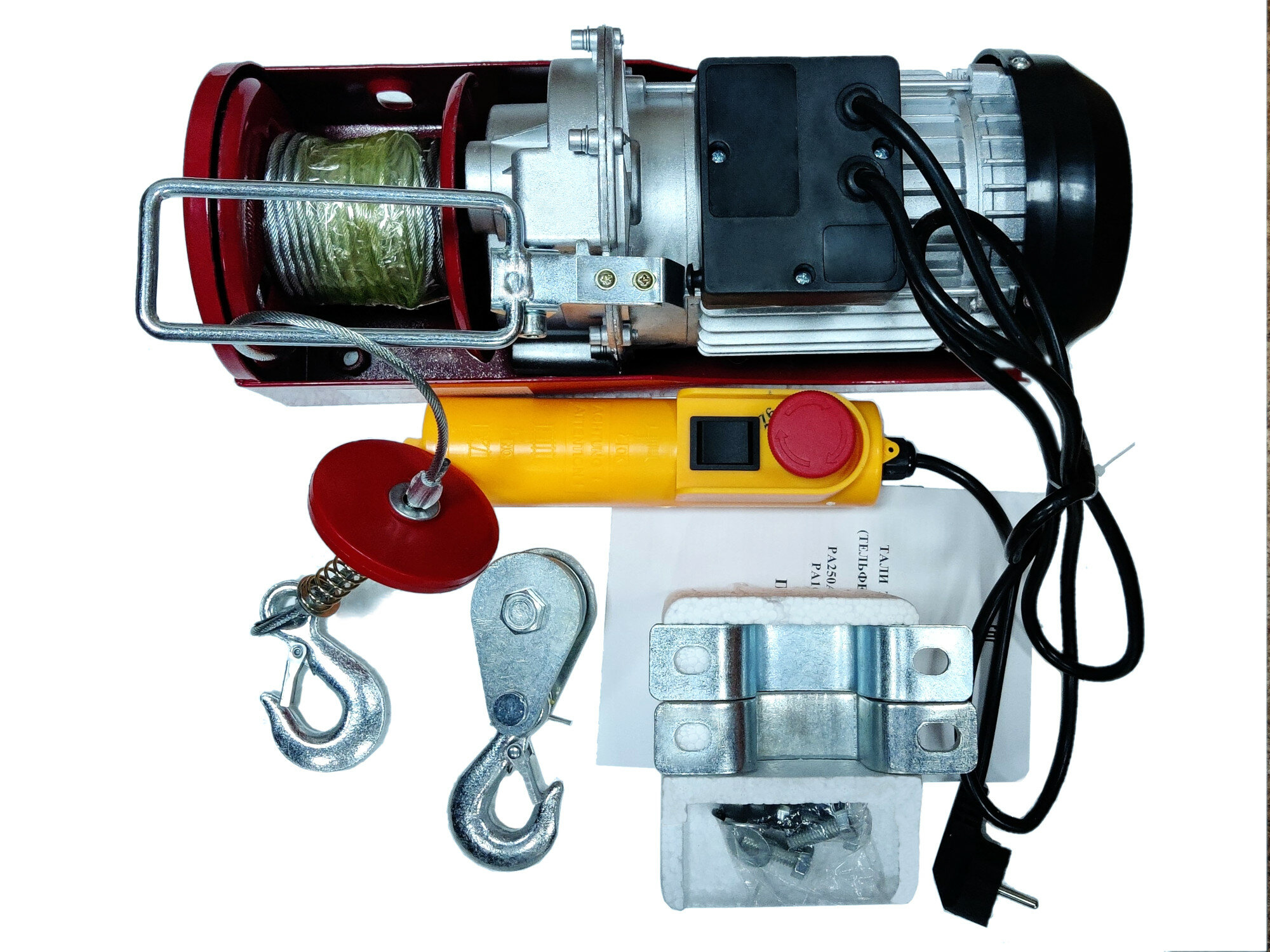 Подъёмник электрический (электрическая таль) модели РА500А, предназначен для подъёма груза массой до 250/500 кг на высоту 11/5,5 м в зависимости от варианта крепления крюка. Длина троса 12 м. Таль приводится в действие при помощи выносного блока управления с двумя кнопками (подъем-опускание груза). В комплект входят специальные крепления для фиксации подъёмника на балке.
