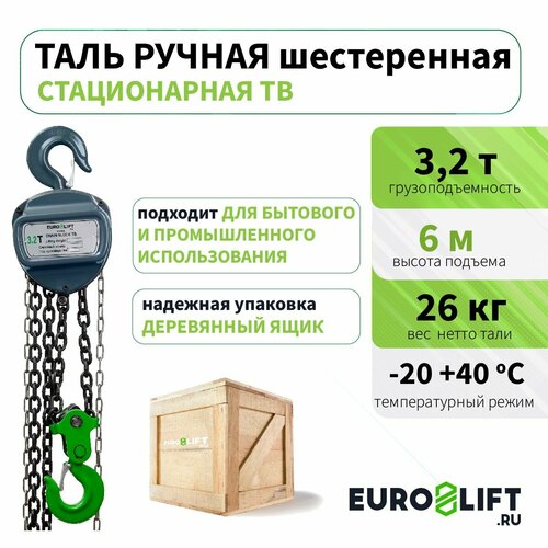 Таль цепная EURO-LIFT используется для подъема и перемещения грузов на высоту до 6 м и весом до 3,2 тонн. Устройство предназначено для погрузочно-разгрузочных работ, может применяться как на производстве, так и в быту. Шестеренная таль обычно имеет более высокую грузоподъемность по сравнению с обычными ручными талями и облегчает работу оператора. В конструкции предусматривается игольчатый подшипник, обеспечивающий продолжительную работу изделия. Механизм обладает повышенной производительностью и безопасностью. Таль ручная цепная проста в работе и обслуживании. Оснащена вращающимся крюком для упрощения процесса строповки. Особенно таль механическая полезна в ситуациях, когда электрический подъемник недоступен или нецелесообразен из-за ограниченного пространства или отсутствия электроэнергии. Ручная шестеренчатая таль подойдет для гаража и мастерской, при строительстве дома или на складе. Изготовлено из материалов с повышенной прочностью и износостойкостью. Изделие сертифицировано по стандартам EAC.
