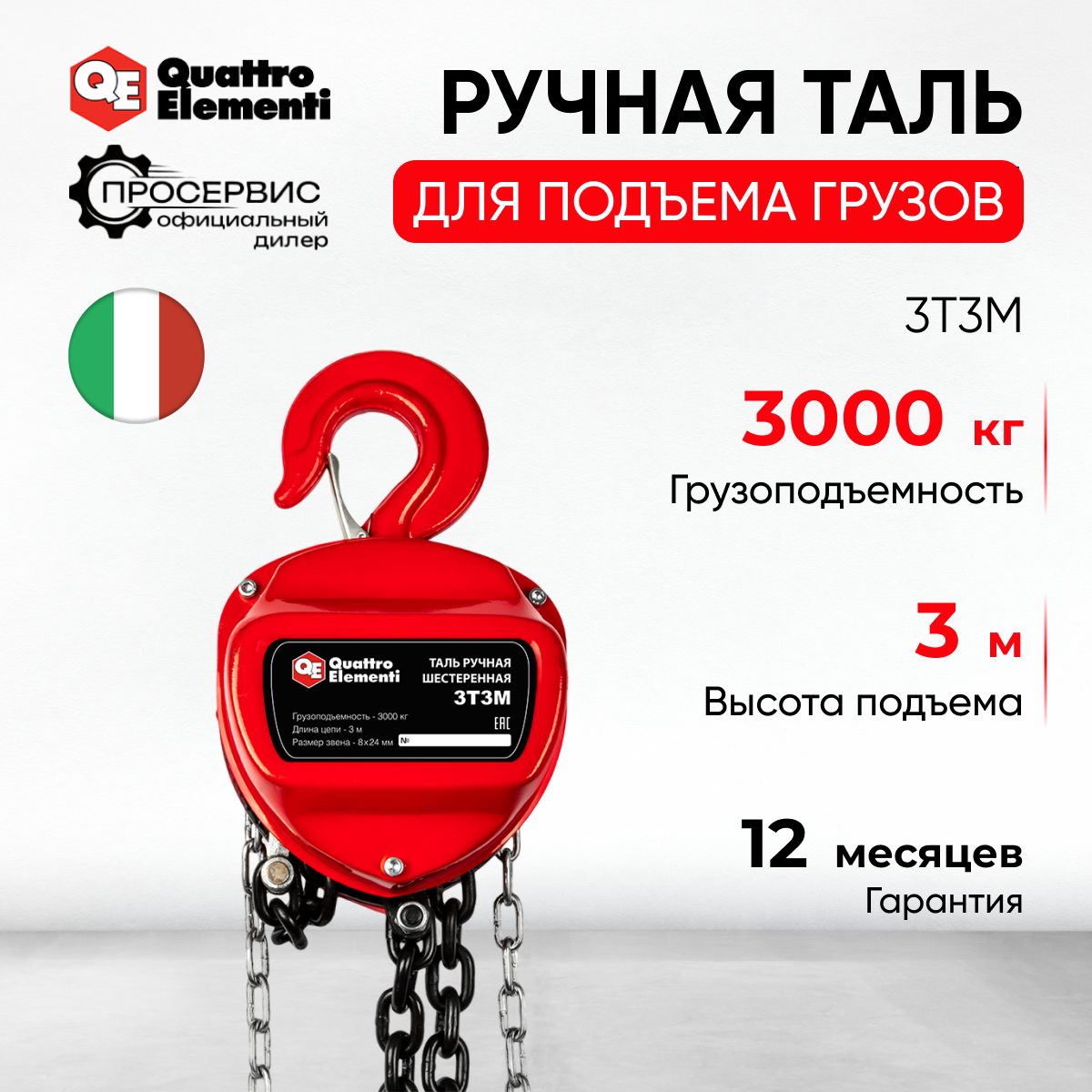 Таль ручная Quattro Elementi 3T3M предназначена для подъема груза весом до 3 тонн на высоту до 3 метров. Простые в использовании и надежные ручные тали оснащены цепями 8-го класса прочности, которые выдерживают 4-х кратные статические нагрузки, что обеспечивает высокую безопасность при работе даже с предельными весами. Игольчатые подшипники в опорных роликах обеспечивают плавный ход грузовой цепи.