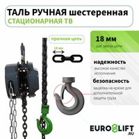 Таль цепная EURO-LIFT используется для подъема и перемещения грузов на высоту до 9 м и весом до 1,5 тонн. Устройство предназначено для погрузочно-разгрузочных работ, может применяться как на производстве, так и в быту. Шестеренная таль обычно имеет более высокую грузоподъемность по сравнению с обычными ручными талями и облегчает работу оператора. В конструкции предусматривается игольчатый подшипник, обеспечивающий продолжительную работу изделия. Механизм обладает повышенной производительностью и безопасностью. Таль ручная цепная проста в работе и обслуживании. Оснащена вращающимся крюком для упрощения процесса строповки. Особенно таль механическая полезна в ситуациях, когда электрический подъемник недоступен или нецелесообразен из-за ограниченного пространства или отсутствия электроэнергии. Ручная шестеренчатая таль подойдет для гаража и мастерской, при строительстве дома или на складе. Изготовлено из материалов с повышенной прочностью и износостойкостью. Изделие сертифицировано по стандартам EAC.