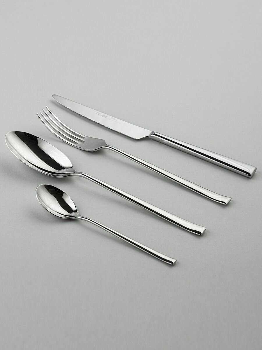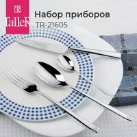 Состав набора: ложки столовые 6 шт, ложки чайные 6 шт, вилки 6 шт, ножи столовые 6 шт. Длина приборов: нож - 23 см, столовая ложка - 21 см, вилка - 21 см, чайная ложка - 14 см. Отлично сбалансированные ручки приборов позволяют приборам удобно ложиться в руку. Приборы TalleR отличают идеальная обработка края и высокое качество полировки.