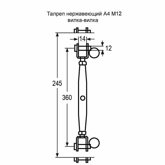 Талреп нержавеющий вилка-вилка из стали А4 (AISI 316) DIN 1478, с резьбой М12, длина талрепа от 245 мм до 360 мм, используется для натяжения тросов (4570 кг на разрыв) диаметр пальца в вилке 12 мм, высота и ширина внутри вилки 20*14 мм. В упаковке 1 штука.