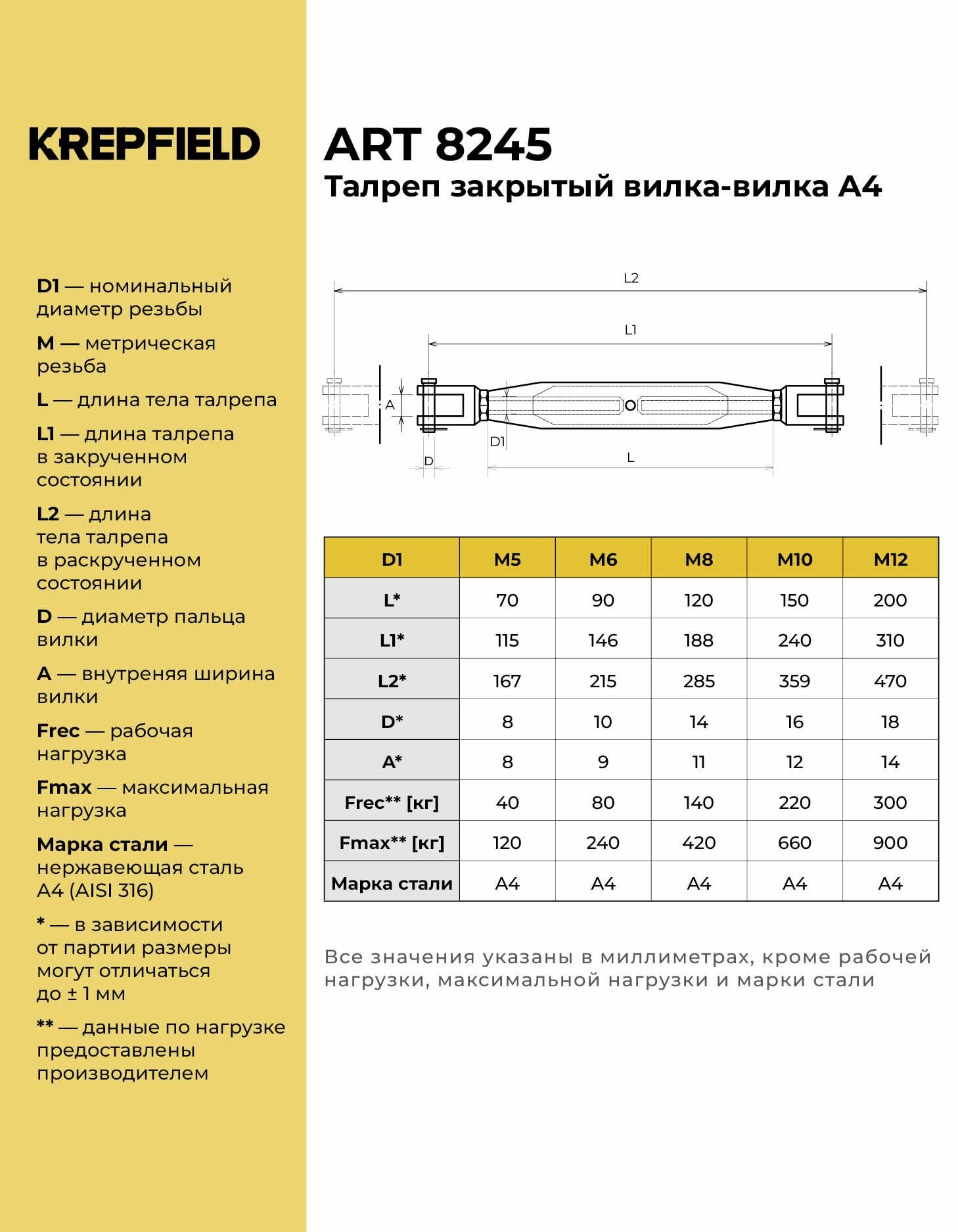 Купить Талреп Нержавеющий М12 ART 8245 А4 вилка-вилка закрытый 1 шт. с доставкой по всей России. Талреп Нержавеющий М12 ART 8245 А4 вилка-вилка закрытый 1 шт.: сравнение цен, характеристики, фото, актуальное наличие и цены.