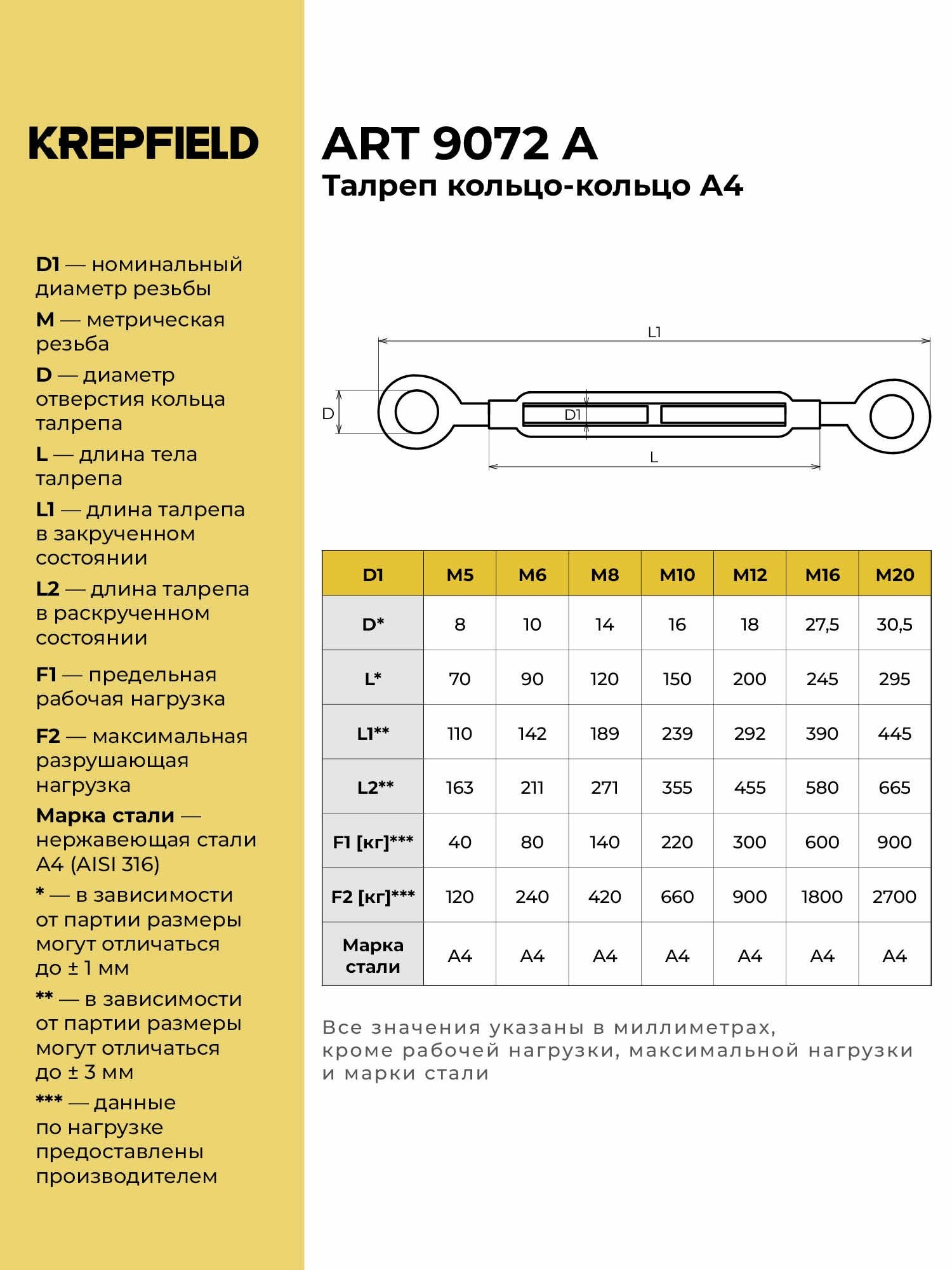 Талреп открытый кольцо-кольцо (тип А) АРТ 9072 из нержавеющей стали А4* предназначен для регулировки натяжения тросов, например АРТ 8382, в такелажных растяжках. Благодаря простоте конструкции имеет высокую надёжность, лёгкость эксплуатации и относительно небольшую стоимость. Коррозионная стойкость стали А4 позволяет использовать талрепы из неё практически в любых климатических условиях, в широком интервале температур и в агрессивных кислых средах.