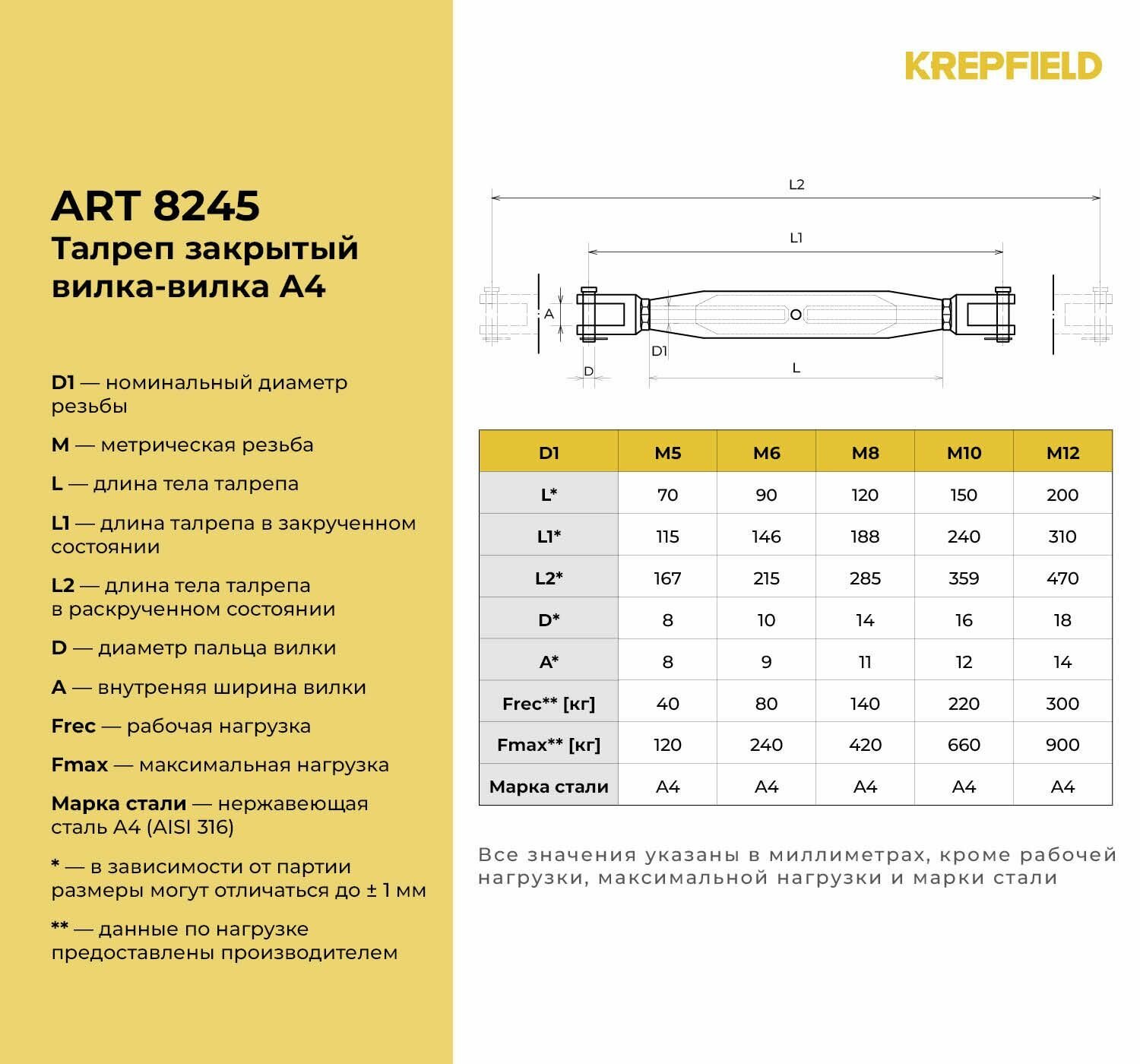 Талреп KREPFIELD Нержавеющий М6 ART 8245 А4 вилка-вилка закрытый 1 шт.: сравнение цен, характеристики, фото, актуальное наличие и цены.