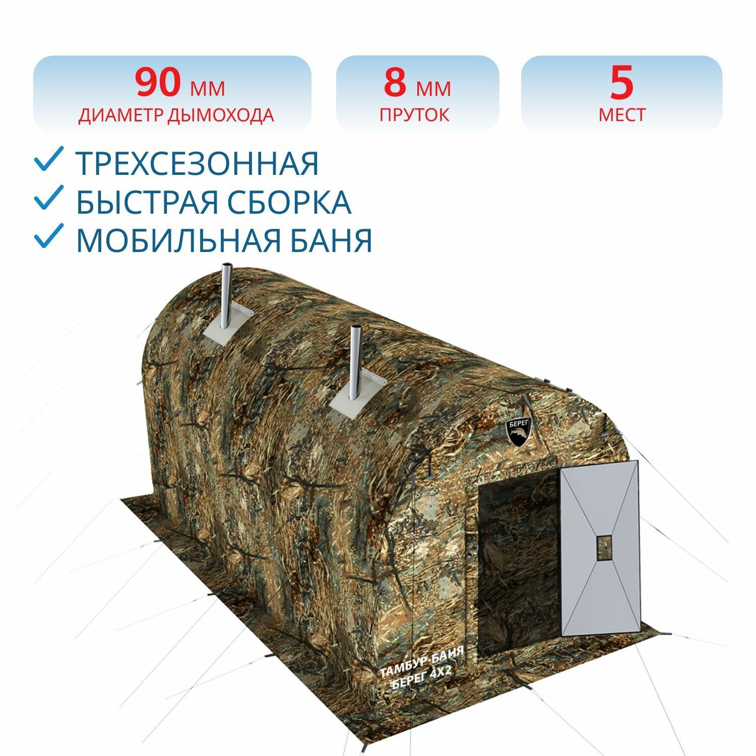 Тамбур-Баня Берег 4х2 к палаткам УП предназначен для увеличения помещения палатки или складирования вещей, переодевания. Подходит ко всем моделям универсальных палаток Берег. Пристегивается на молнию и соединяется через специальный козырек, оборудован разделкой дымохода для установки печи, и за счет этого может использоваться в качестве самостоятельной палатки / походной бани / кухни и тд. Стенки со входами с обеих сторон можно целиком отстегнуть. Каркас изготовлен из алюминиевого сплава, материалом тента служит водонепроницаемая ткань. Тамбур-баня оборудован алюминиевым каркасом, отстегивающейся перегородкой на молнии (делит помещение на два; одно 2 м. на 2 м, второе 2 м. на 2 м.), разделкой дымохода, двумя входами на молнии, распашной дверью, окнами с москитными сетками и липами для крепления палаткам серии УП.