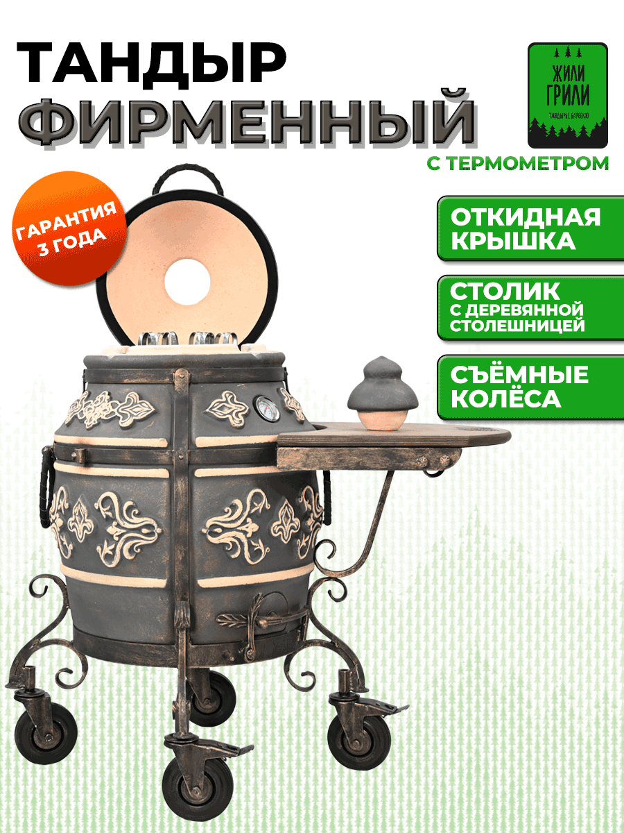 Тандыр Фирменный с термометром, с откидной крышкой, со столиком с деревом, на колесах, цвет графит патина: сравнение цен, характеристики, фото, актуальное наличие и цены.