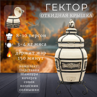 Тандыр Гектор выполнен в виде округлого бочонка среднего объёма. Тандыр имеет крышки двух уровней (колпачок и крышку). Удобно выполненный колпачок, позволяет не терять тепло при открывании тандыра. А крышка с удобными ручками позволяет легко открывать тандыр и закладывать в него продукты для приготовления. Кованная подставка - ножки обеспечивает удобное использование тандыра. Красоту тандыру придаёт интересный декоративный орнамент, расположенный в центральной его части. Керамический тандыр в основном выполнен в бежевом цвете, коричневый цвет добавлен в области узора. На поверхность орнамента нанесена глазурь, которая защищает его от влаги и грязи. Изготовленный из шамотной глины высокотемпературного обжига он обладает высокой теплопроводностью, экологичностью, прочность и долговечностью более 10 лет.
