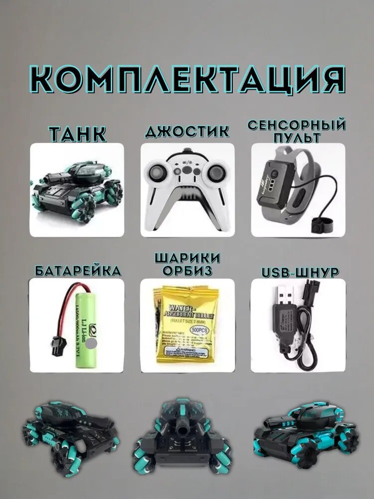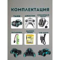 | Подробная комплектация | Танк, джостик, сенсорный пульт, батарейка, шарики орбиз, USB-шнур |