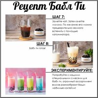 ***Рецепт на 0,5 л: Порошок со вкусом 30 гр. + Порошок сливки 30 гр, 80 мл. горячего чая (или кипятка) - перемешать с порошком до полного растворения, 200 мл. воды + 60 мл. льда (или полностью льда), 30 - 50 г. тапиоки. Вскипятите в кастрюле воду, бросьте в нее тапиоку в соотношении 1 (тапиока):6 (вода), постоянно помешивая, пока шарики не всплывут на поверхность. Варить на медленном огне без крышки 30 минут, время от времени помешивая. После варки коричневые шарики тапиоки принимают чёрный цвет. Не сливая воды, дайте настояться тапиоке ещё около 30 мин. Откиньте тапиоку на дуршлаг и промойте холодной водой. После нужно настоять её в сладком сиропе 15-20 минут. После этого тапиока готова к употреблению.
